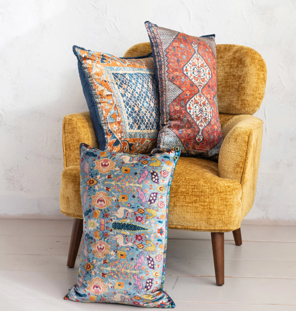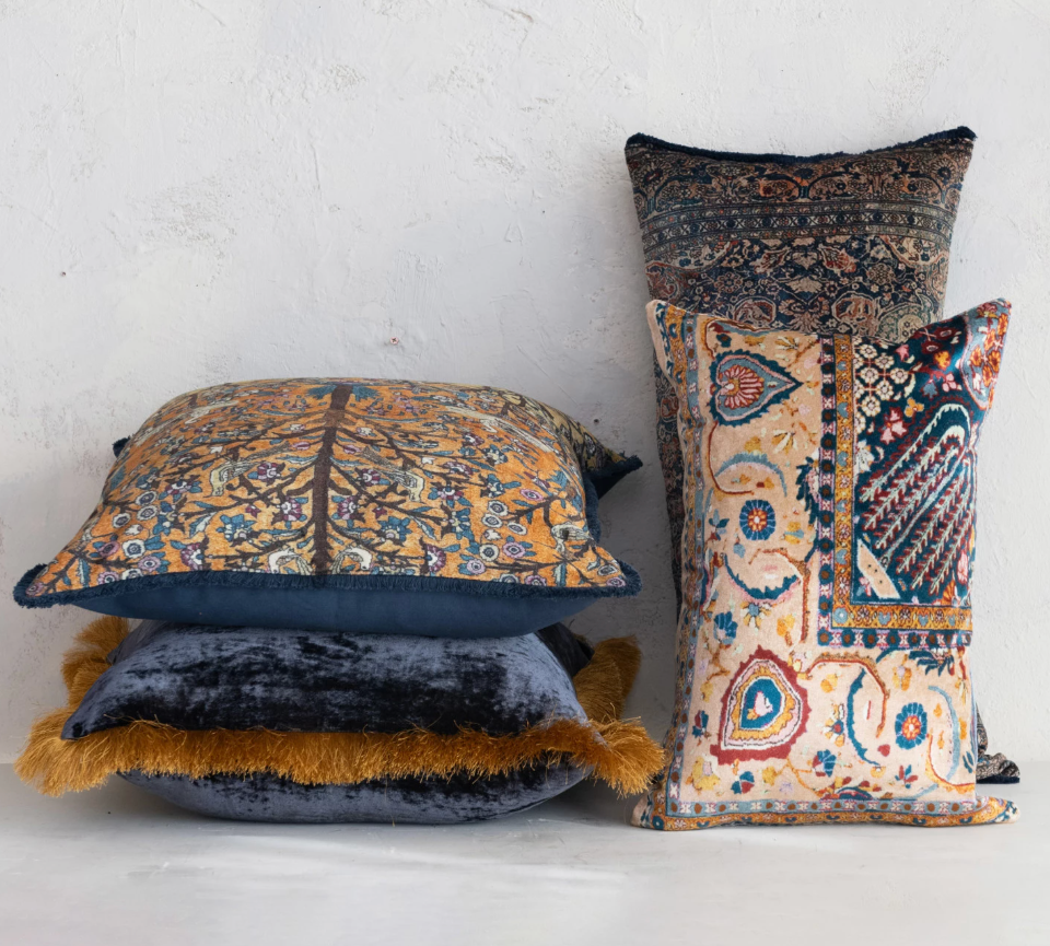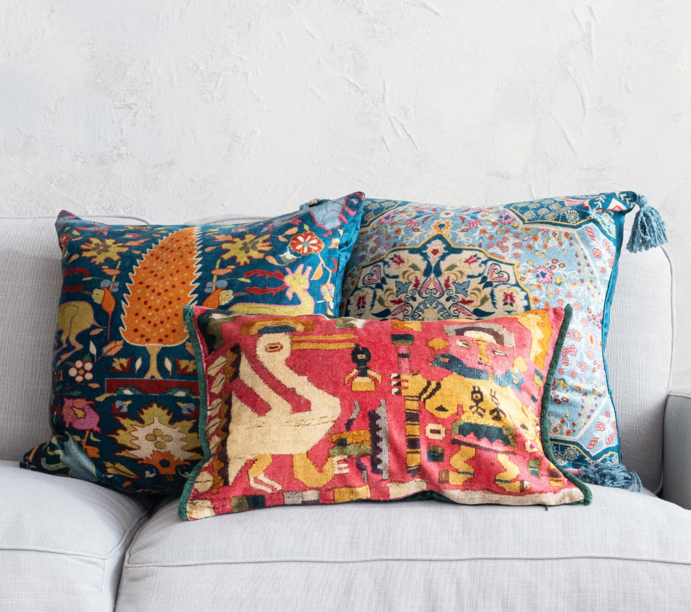 20" Square Cotton Blend Velvet Printed Pillow with Vintage Carpet Pattern