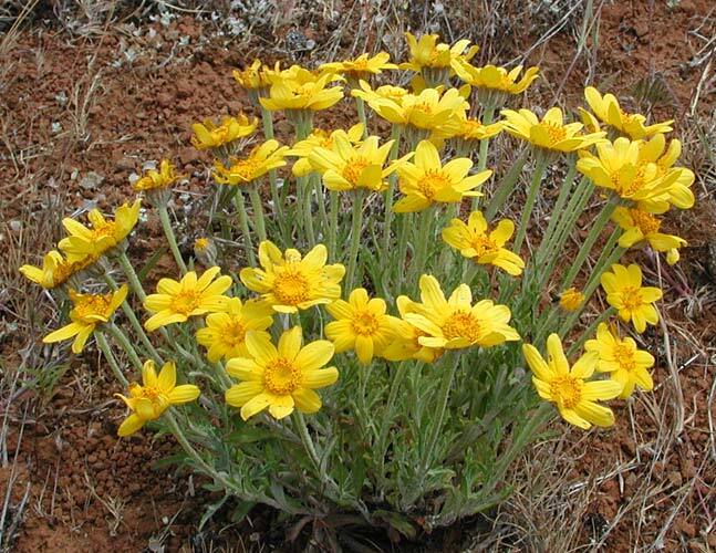 The wooly sunflower grows in well-branched clumps. Both stems and leaves may be covered with wooly gray hairs that conserve water by reflecting heat and reducing air movement across the leaf’s surface. The hairs impart a dusty gray color to the plant.