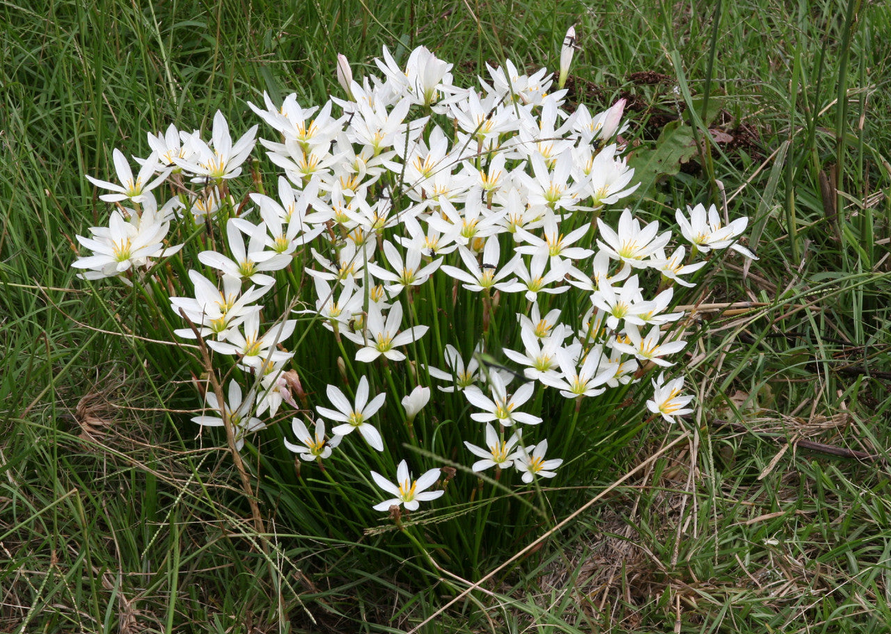 Zephyranthes candida (Fairy Lily) - This is a bulb with evergreen, rush-like foliage that forms a 1 foot tall and 2 feet wide clump. In the late summer and fall, white tubular flowers with six petals and yellow stamens, bloom on stems that are as tall as the foliage. Grow in sun or part shade in most any soil and water regularly or allow soil to dry slightly between irrigations to induce flowering. A very hardy plant that will die down and reportedly survive temperatures as low as 0 degrees F but is evergreen in milder climate areas with temperatures no colder than the high teens. This versatile plant can be used in mass plantings, in rock gardens, as a container plant or partially submerged in the water garden. The common names used include Fairy Lily, Peruvian swamp-lily, White Zephyr Lily and Rain Lily, for their habit of flowering after rains, and it apparently is also called Dwarf Onion when sold for aquarium or terrarium use.