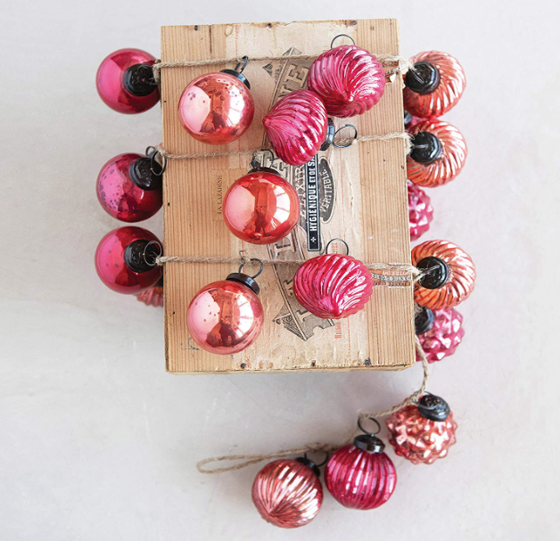 Enjoy the various designs of these glass ornaments. They are attached to a fabric string and create an antique garland to be envied by all. Lay it on a surface around larger items, add to a decorative piece filled with other items, hang on a fireplace mantel or in front of a window.