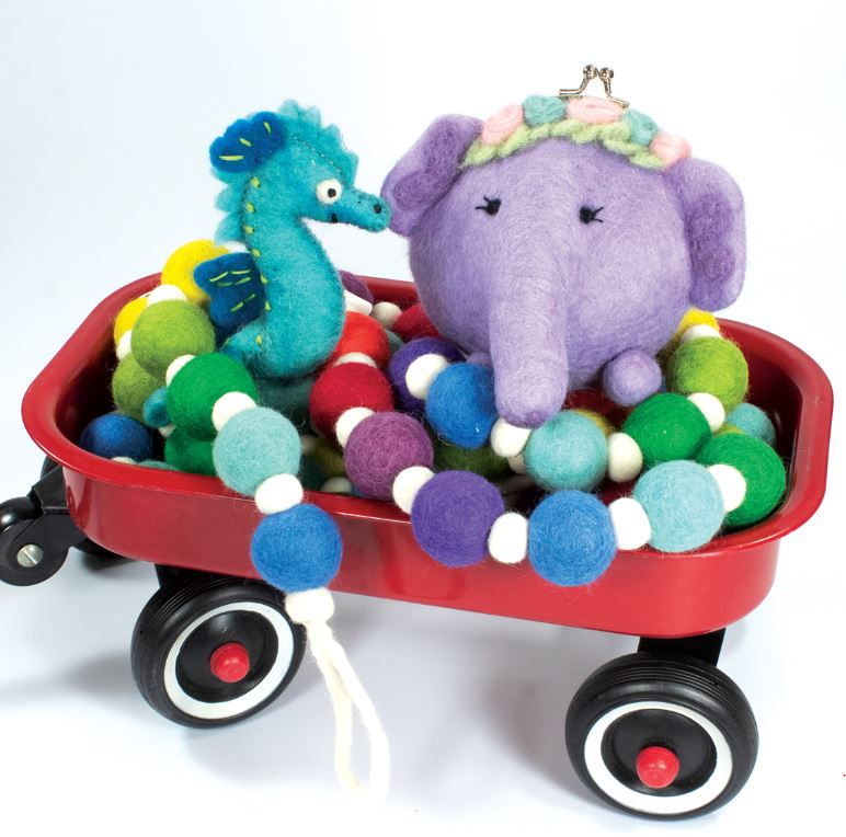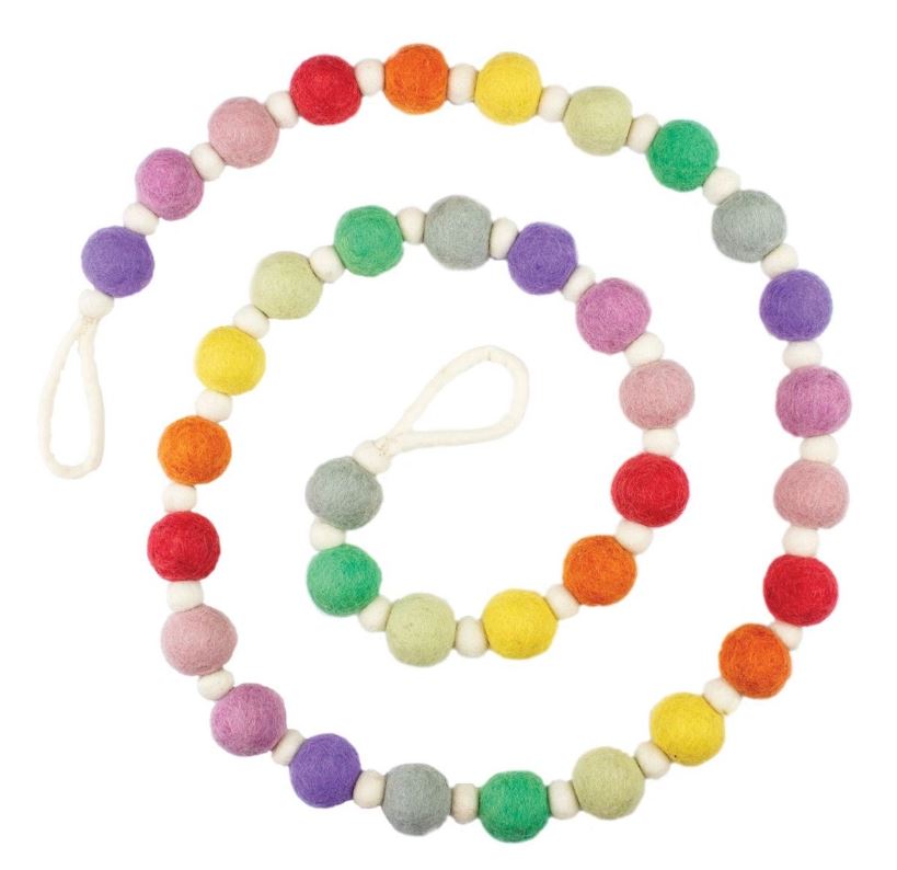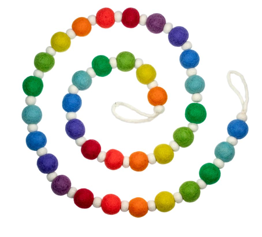 This festive looking garland is a sweet treat for your customers! Touching is believing when you feel the sumptous texture of each individually handfelted ball. Ends include 3 inch long loops for handy hanging. Skilled artisans in Nepal use 100% natural wool and non-toxic dyes to assemble this keepsake gift.