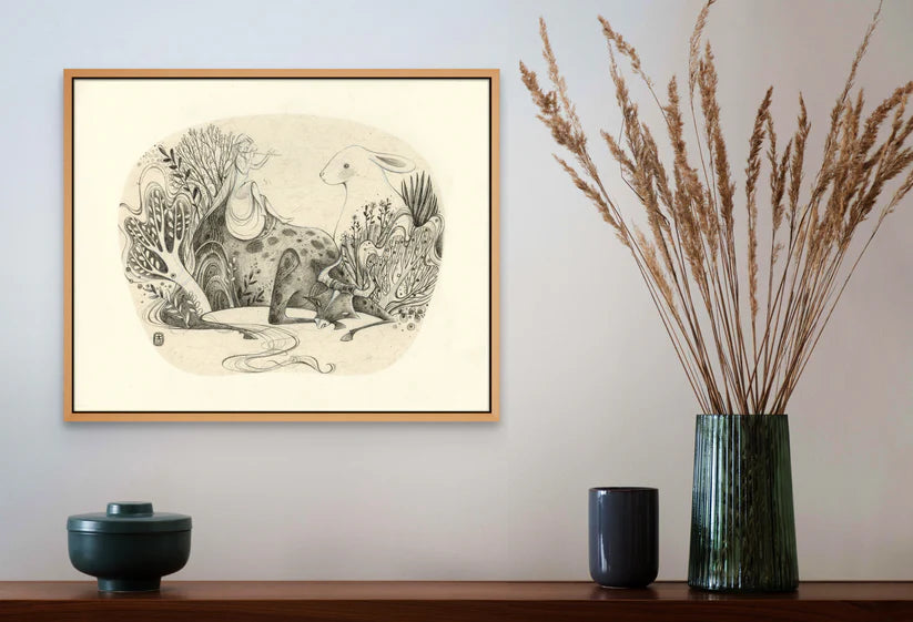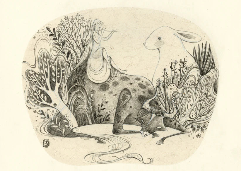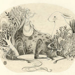Alina Chau Watercolor - A Girl, Water Buffalo, and Rabbit Fantasy Art "8 x 11"