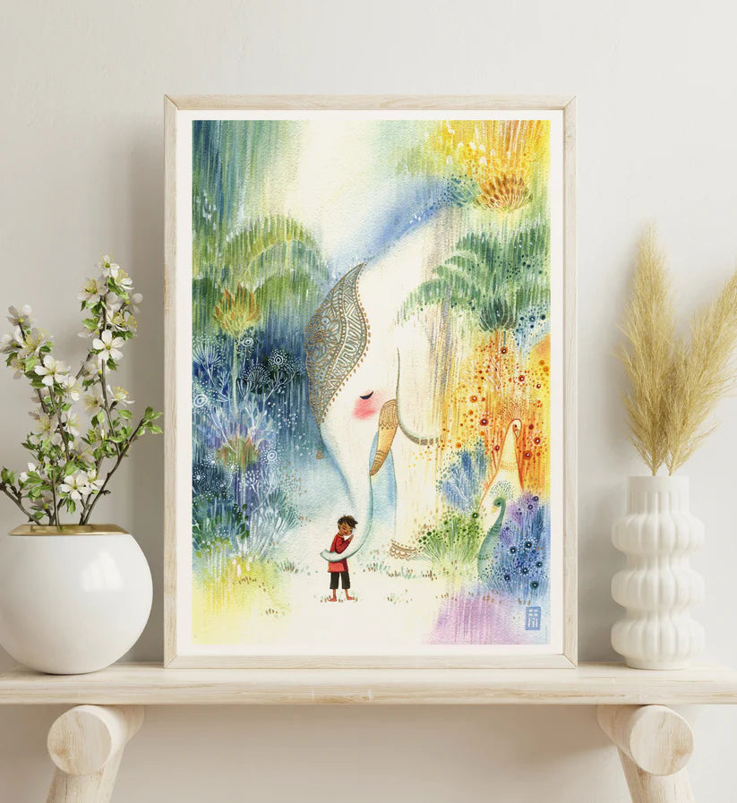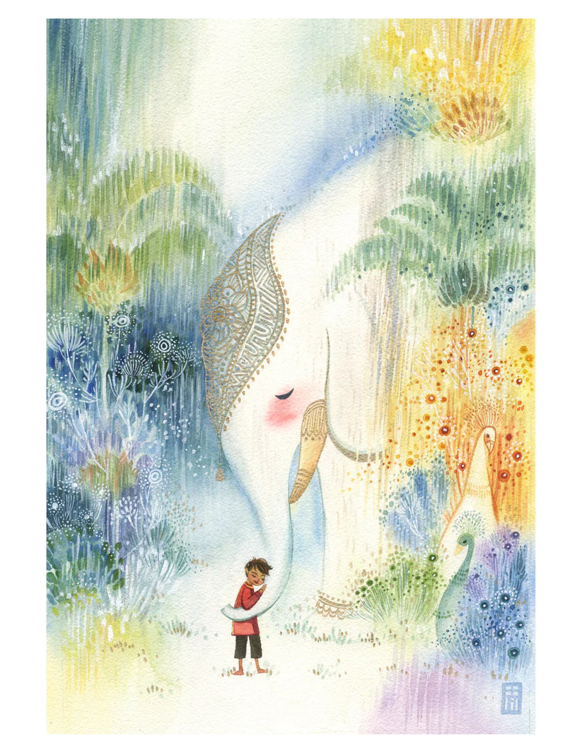 Alina Chau Watercolor - An Elephant and a Boy in Summer Rain Whimsical Art 11"x16"