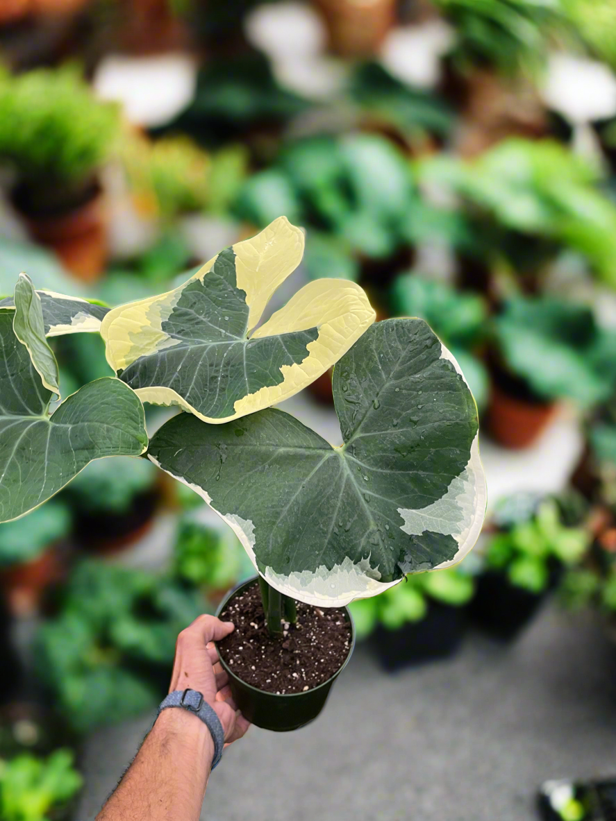 - Botanical Name: Xanthosoma sagittifolium 'Variegatum Monstrosum'