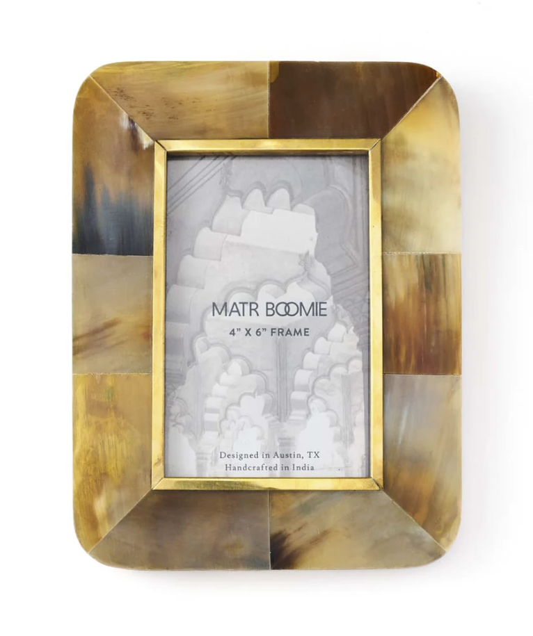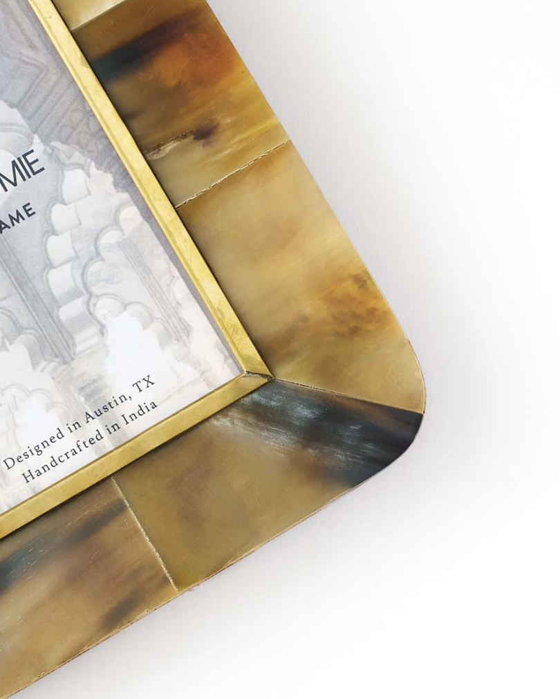 Showcase your favorite moments with the Kachhua 4x6 Rounded Picture Frame, featuring exquisite cruelty-free horn and brass inlay. Its unique tan and cream patterns beautifully highlight your memories, while its versatile 2-way easel design allows for horizontal or vertical display. This frame can also be displayed as a part of a gallery wall. Celebrate your story with a piece that brings warmth and joy to your home!