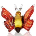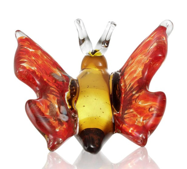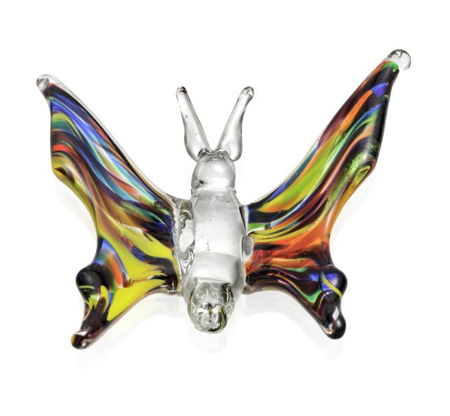 This art glass butterfly may be petite, but it has a glowing personality. Mottled, orange-y fire-red wings with subtle streaks of blue-gray and a mustard brown body or the beautiful rainbow wings. Glass blown by hand - shape, colors and pattern vary.