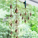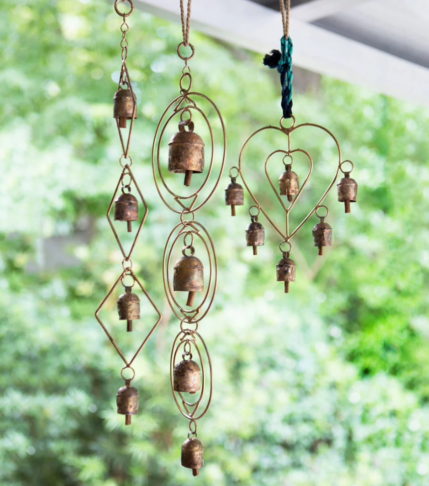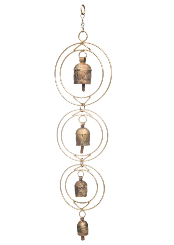 Metal hanging bell wind chime displays four handcrafted bells in a cascading loop setting with sturdy hanging loop. Made by artisans in India, using traditional metalworking techniques, this bestselling wind chime with bells would make a lovely wedding present or housewarming gift and can be displayed indoors or outdoors as a piece of unique metal art.