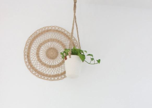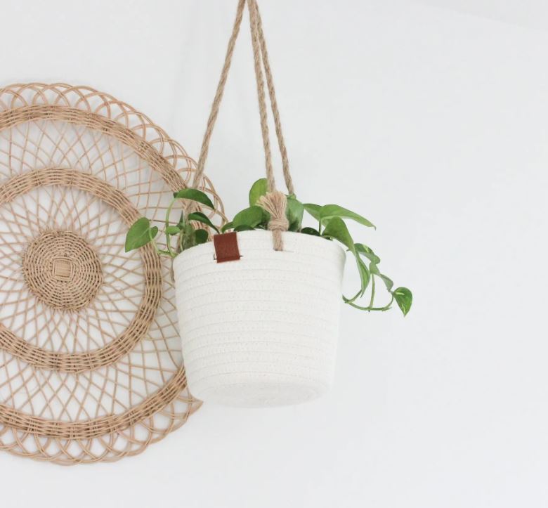 This off white cotton rope basket makes for a modern, soft-to-the-touch hanging planter. A leather accent adds a boho touch. Plastic lining included to protect the basket.