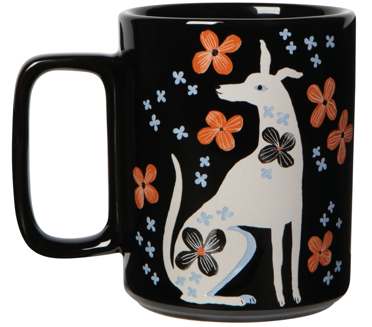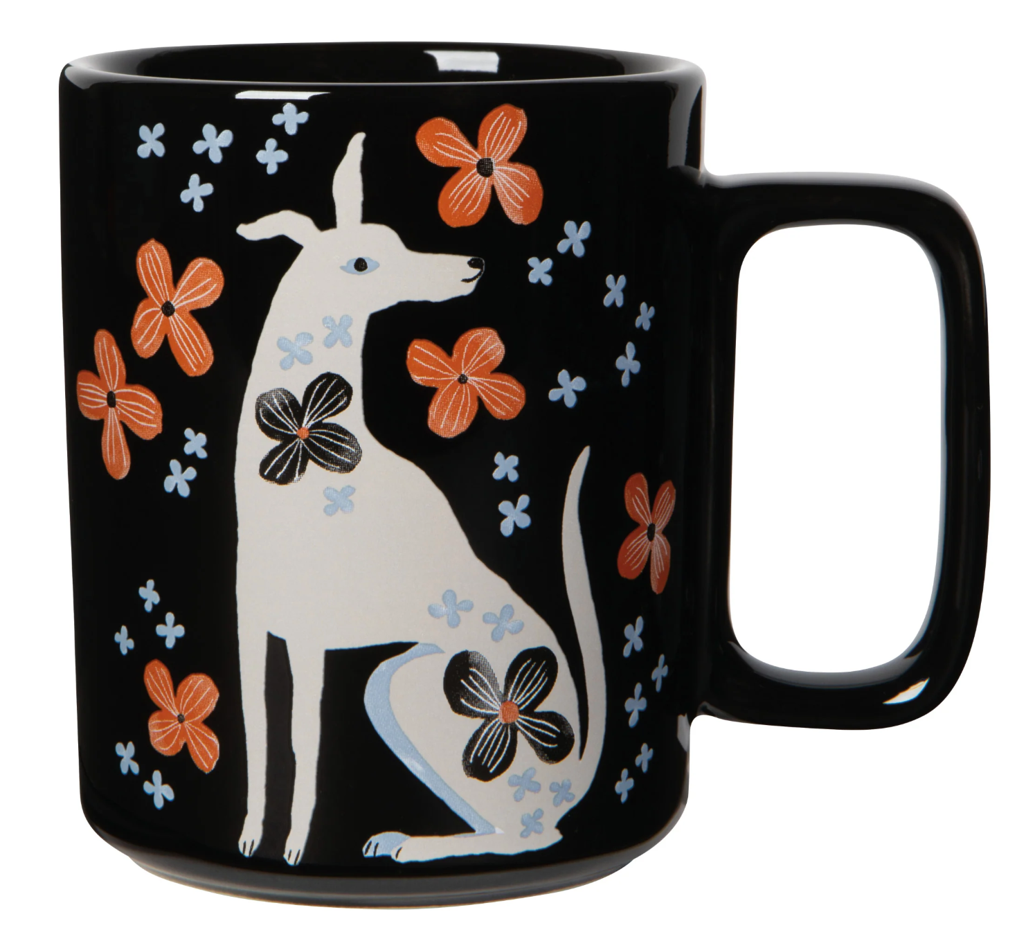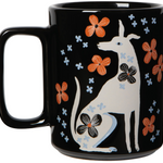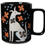 A new mug shape features a unique rectangular handle.This design invites you to roam along the country road with a playful pup and a palette of rich rust, serene blue, and striking black conveying an unassuming beauty.