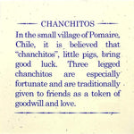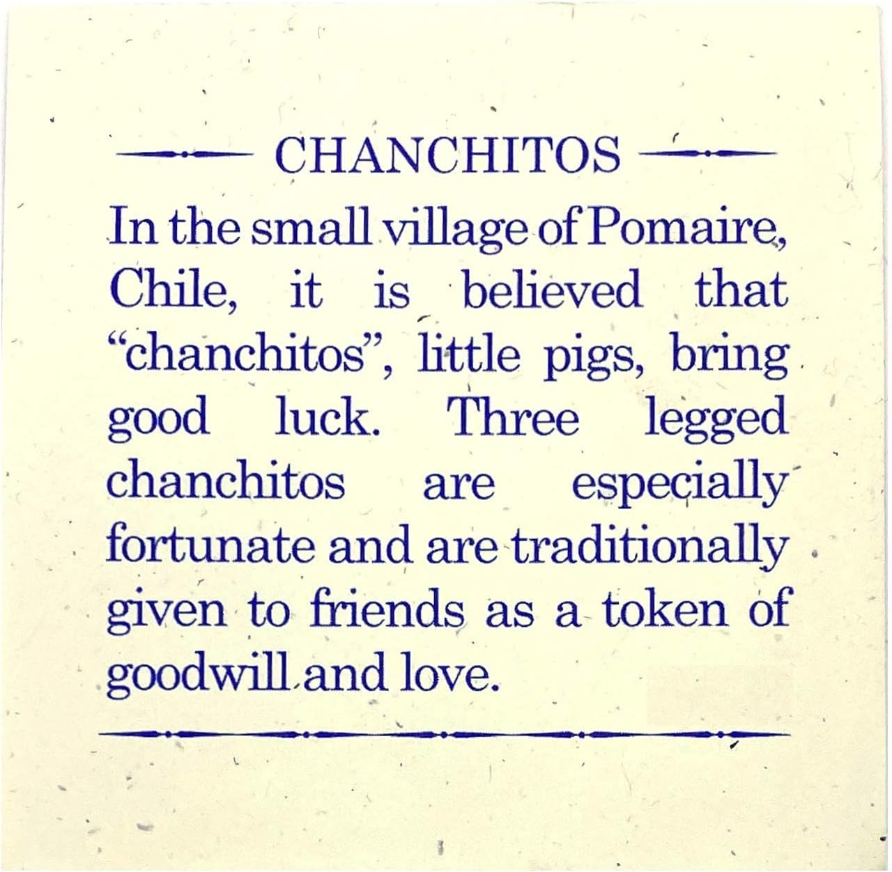 A "chanchito good luck pig" is a three-legged ceramic pig from Pomaire, Chile, that serves as a symbol of good fortune. It represents abundance, happiness, and goodwill and is traditionally gifted to friends and loved ones as a token of good luck and affection.