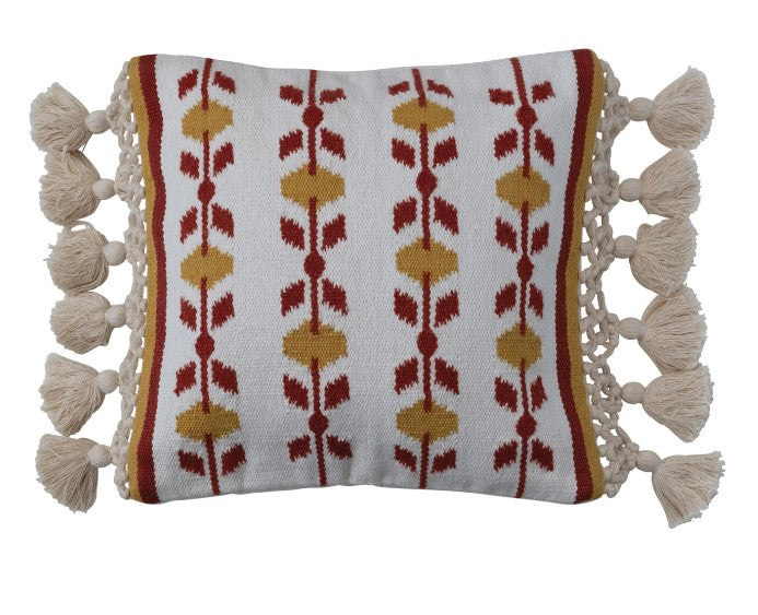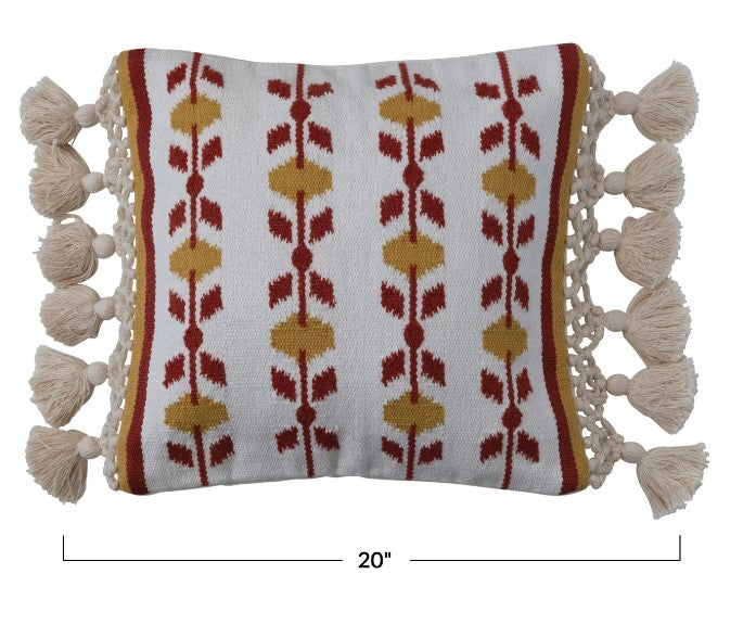 20" Square Hand-Woven Cotton & Wool Pillow w/ Embroidery, Crochet & Tassels, Polyester Fill, Multi Color