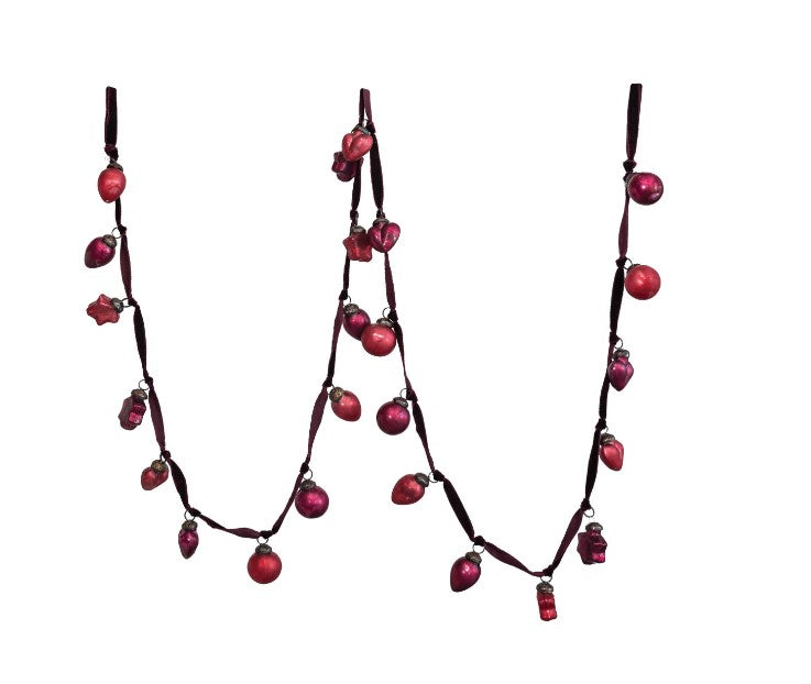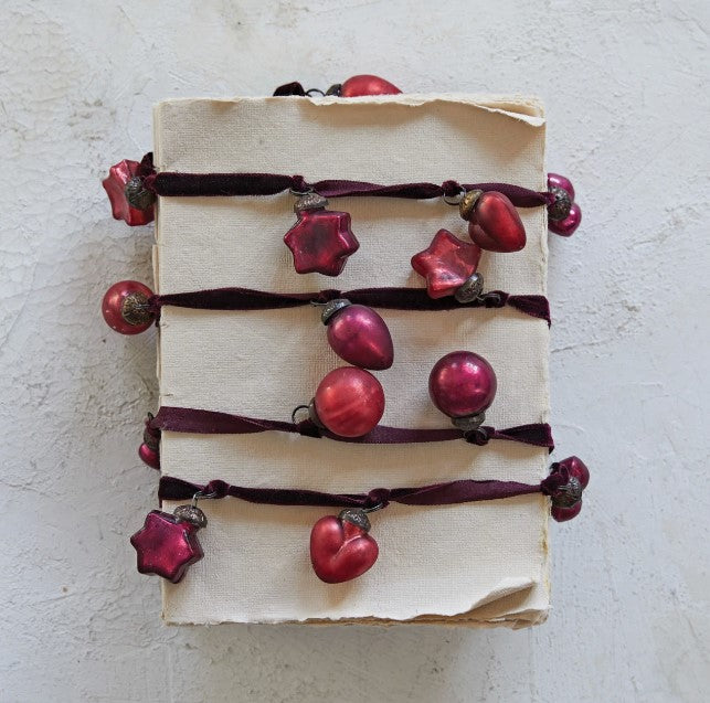 Enjoy the various designs of these glass ornaments. They are attached to a fabric string and create an antique garland to be envied by all. Lay it on a surface around larger items, add to a decorative piece filled with other items, hang on a fireplace mantel or in front of a window.