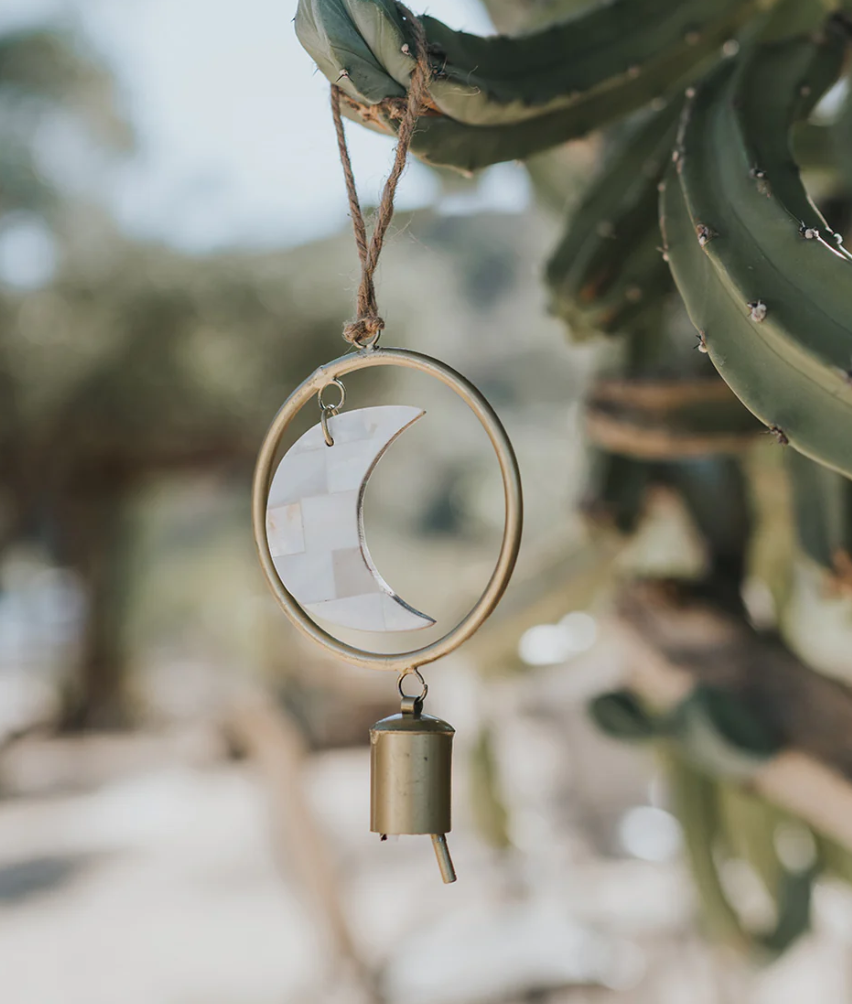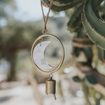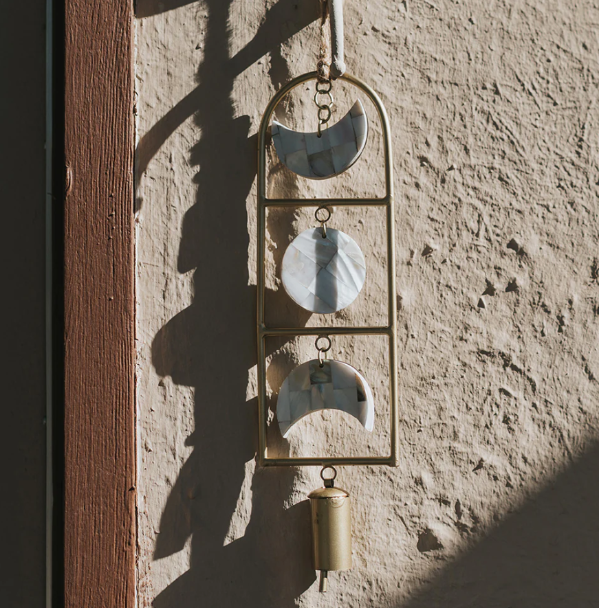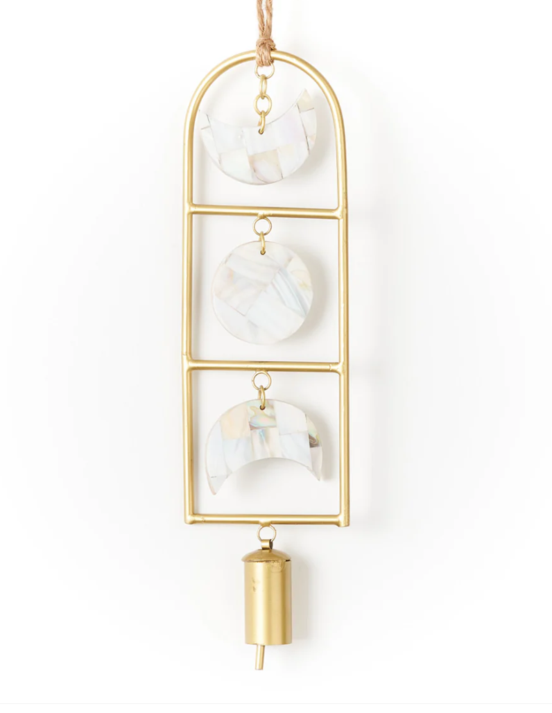 Our radiant Chayana bell chime collection honors the lunar phases of the moon with mother of pearl shell and handmade bells. Artisans apply age old bell craft techniques and hand tools to shape and tune each bell. The minimalist, boho chic design features stacked crescent moon and full moon shell tiles, one 2" long bell, and a sturdy jute hanging loop. This decorative bell chime is ideal for use as an indoor chime. It can also be used as an outdoor chime protected by a covered patio. Moon phase decor is a great reminder to connect with nature and her rhythms as we set intentions and navigate life's opportunities and challenges. The natural iridescence of mother of pearl mirrors the illuminated face of the moon in the night sky, which serves as both a beacon and a powerful symbol across the earth. The crescent moon is often associated with the divine feminine, as well as symbolic of creativity, manifestation, new beginnings, and growth. This decorative Indian bell chime will add celestial radiance and ethereal bell song to any space. It could make a meaningful fresh start gift, dorm decor gift for a graduate, housewarming gift for a new homeowner, or gift for a yogi or healer who values a sacred space for restoration.