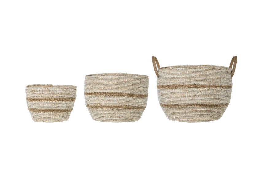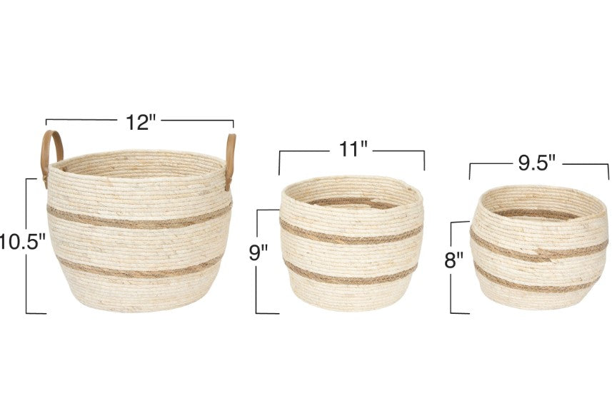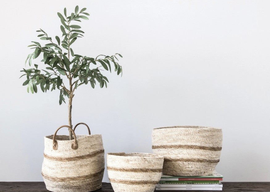 Baskets are one of those wonderful decoration pieces that can also be practical. These maize baskets feature decorative brown stripes and the largest has leather handles. They come in three sizes and bring added flair to the room while storing miscellaneous items inside or be used as decorative covers for potted plants.