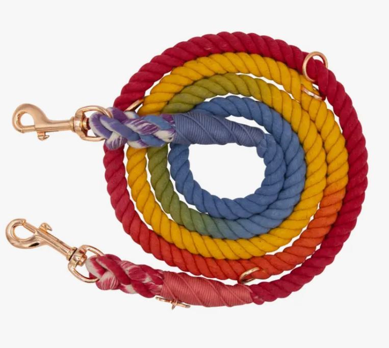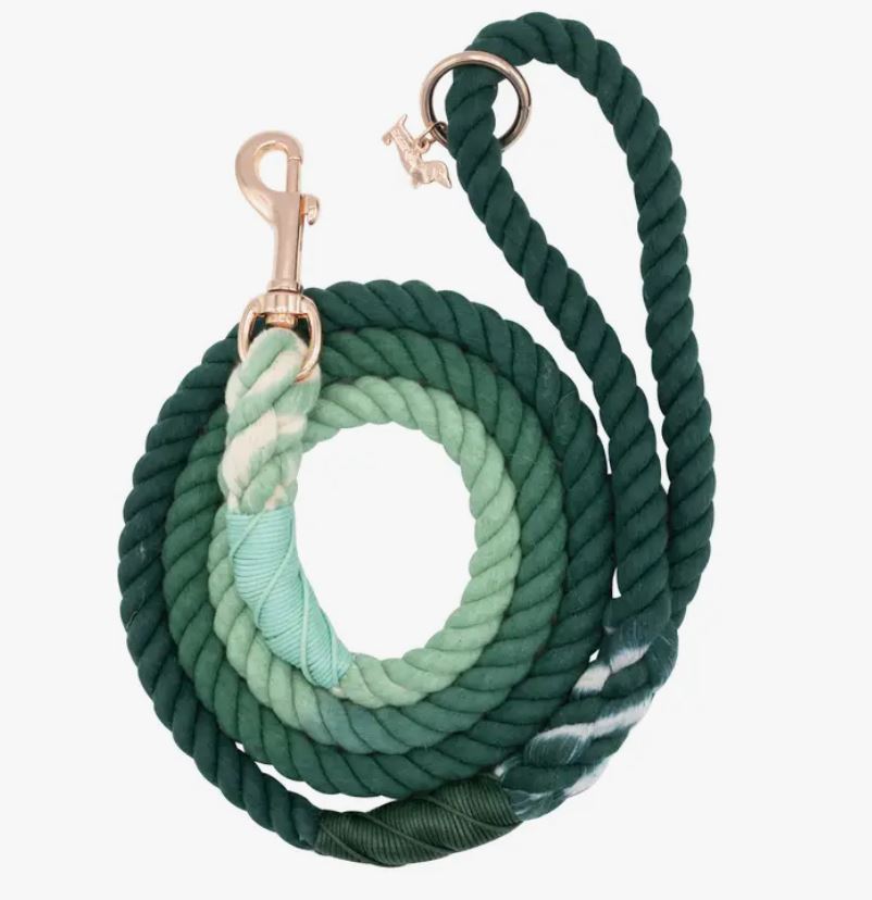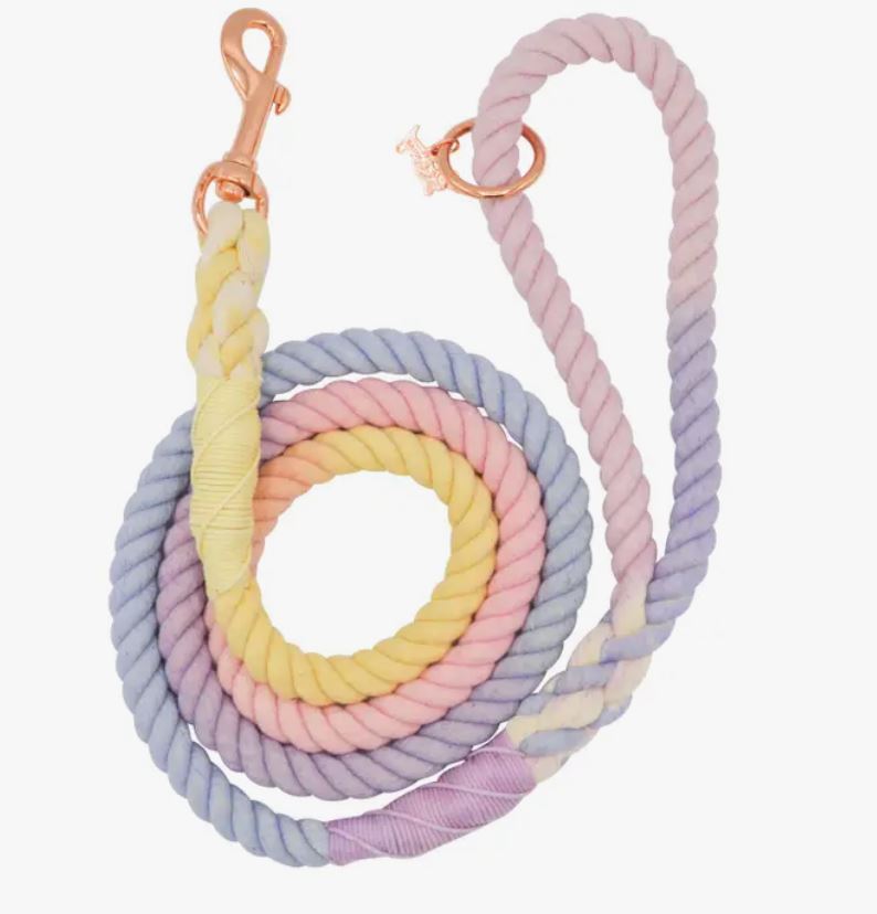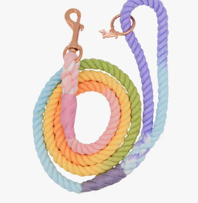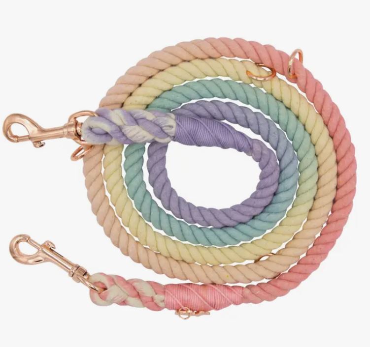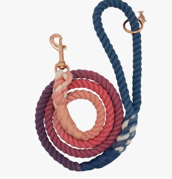 Beautiful colored rope will be sure to add a pop of color to any dog’s wardrobe! Made with strong, 100% cotton rope and natural dye. The rope is hand-spliced and ends are whipped to add strength and durability. Finished with beautiful rose gold hardware with a rose gold dog charm and accessory ring.