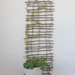 - This organic, hand-crafted wall trellis showcases a cascading ladder of filbert wood bound by woven jute