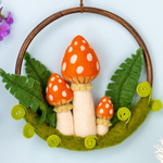 Delightfully hand-crafted felt mushrooms grow amidst a micro grove of artistically felted ferns, artfully framed within an 8" natural cane hoop! Hang anywhere with the faux suede loop.