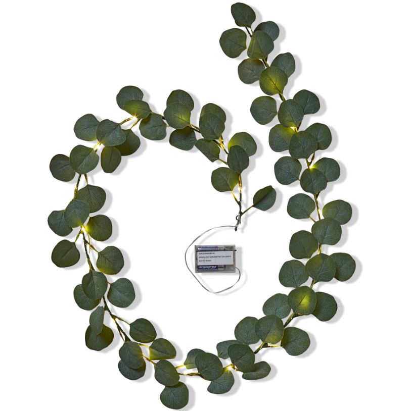 Turn any space in your home into an enchanted escape. This lush eucalyptus garland is a perfect way to bring the outdoors in and each strand features LED lights for an added touch of whimsy. This garland requires three aa batteries and can be toggled between on, off, or a six-hour timer. Each piece features 20 lights that give off a warm glow. Dust to clean.