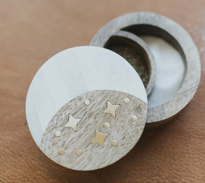Ethically handcrafted from sustainably harvested mango wood in north central India, our enchanting Nakshatra Collection features beautiful, inlaid crescent moon and star constellation designs. This round, solid box is expertly crafted with two compartments. The lid features a crescent moon, featuring ethically sourced bone and a star constellation handcrafted from gold finish brass. This versatile box can be used for jewelry, keepsakes, stationary or as a salt and pepper cellar in the kitchen. The art of traditional Indian wood craft requires mastery, passed on through generations, to create intricately hand carved treasures from solid blocks of mango wood.
