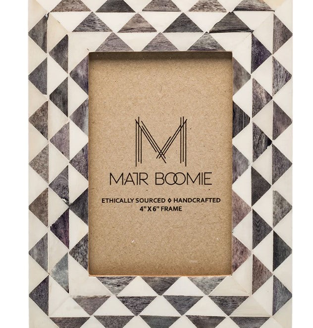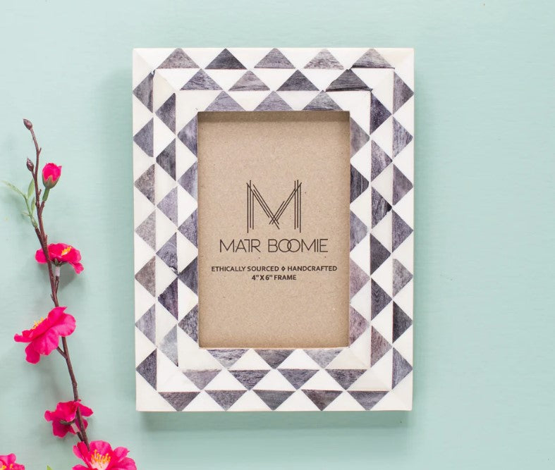 Handcrafted photo frame features ethically sourced bone inlay in triangle wave design. Accommodates a 4x6 photograph or print. The picture frame features a two-way table top easel and d-rings for hanging.
