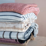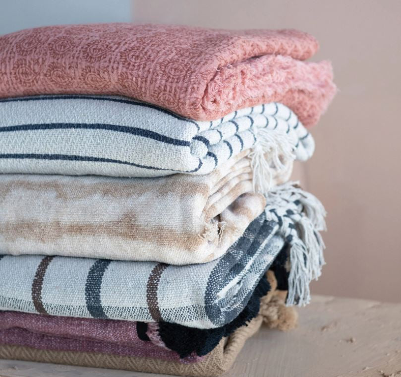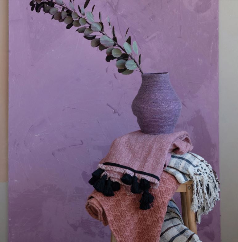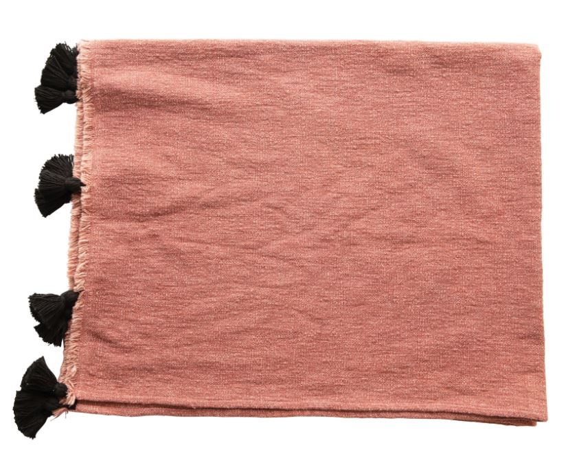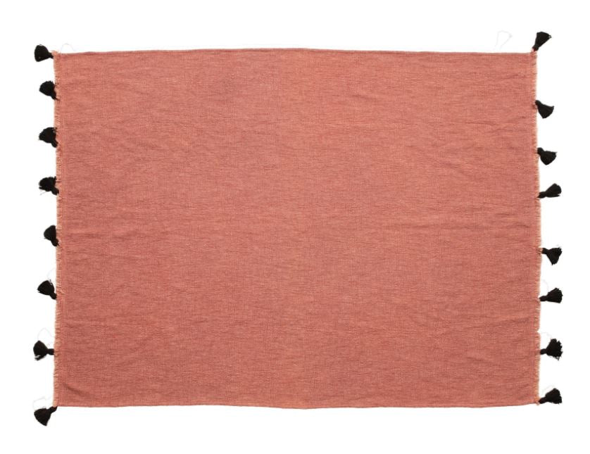 This attractive cotton blend throw with tassels has a lovely rose tone with contrasting black detail. It is a delightful throw that adds a colorful touch to your room decor. You will surely enjoy this soft and cozy covering that will complement many design styles.