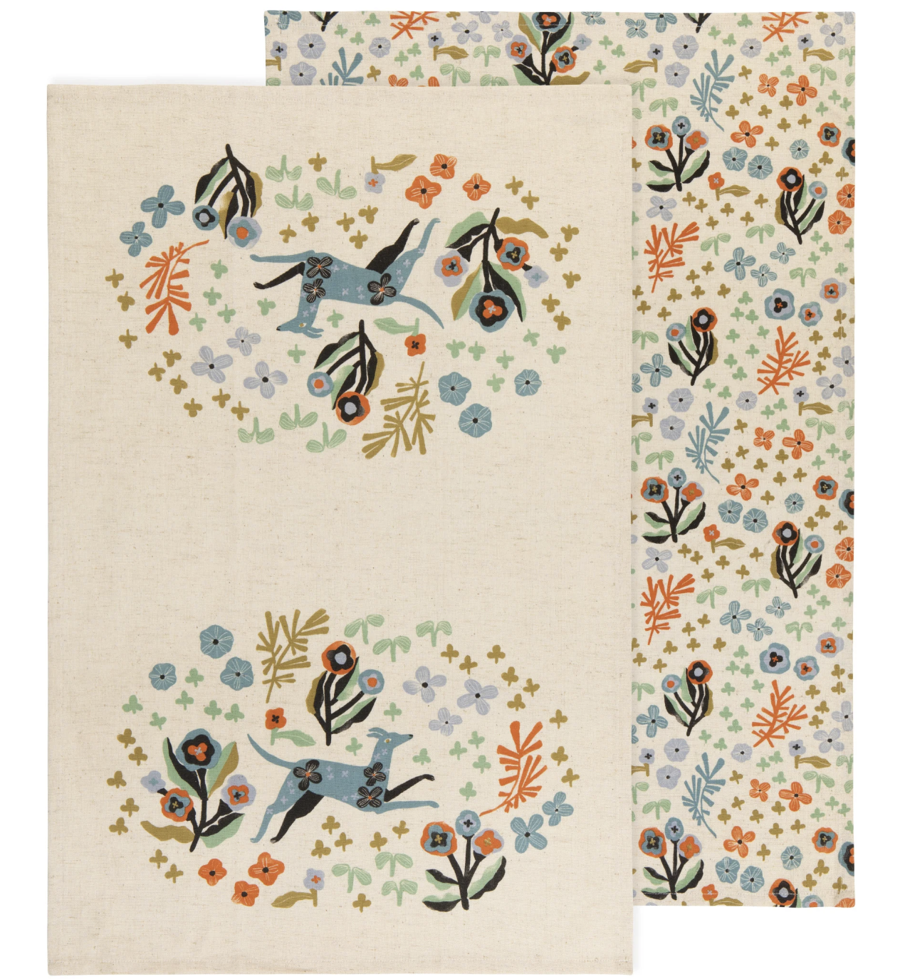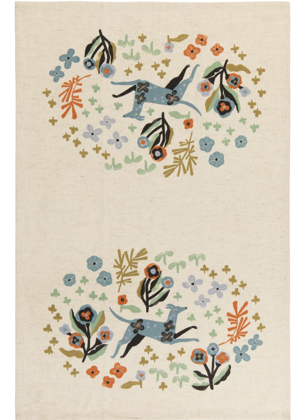 Add life and character to your kitchen with our fun and colorful printed and woven cotton dishtowels. A perfect combination of form and function, these towels will make washing up less of a chore. Conveying an unassuming beauty this design, from the Dogwood collection, roams along the country road with a playful pup and a palette of rich rust, serene blue and striking black.
