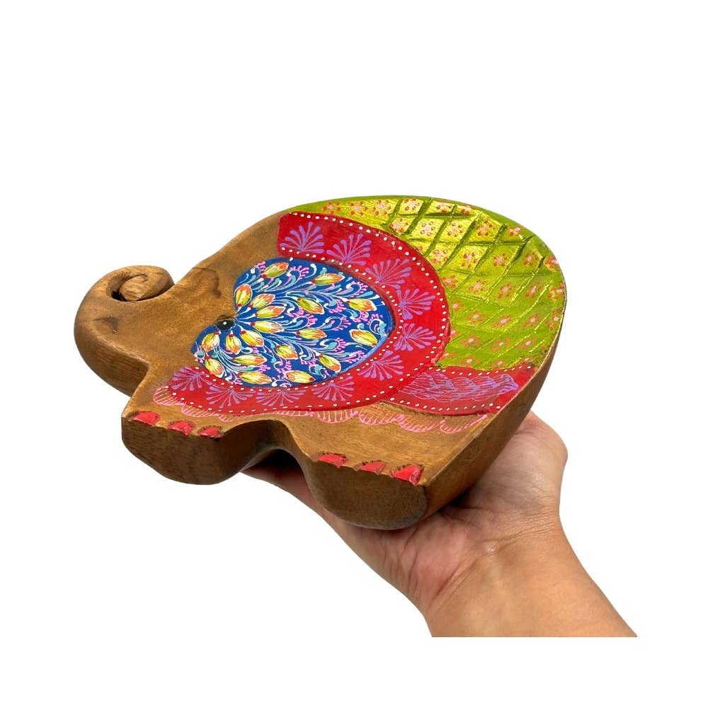 Hand painted wooden elephant carving is a versatile piece. Use it as a trinket dish or hang it on the wall. Assorted paint colors.
