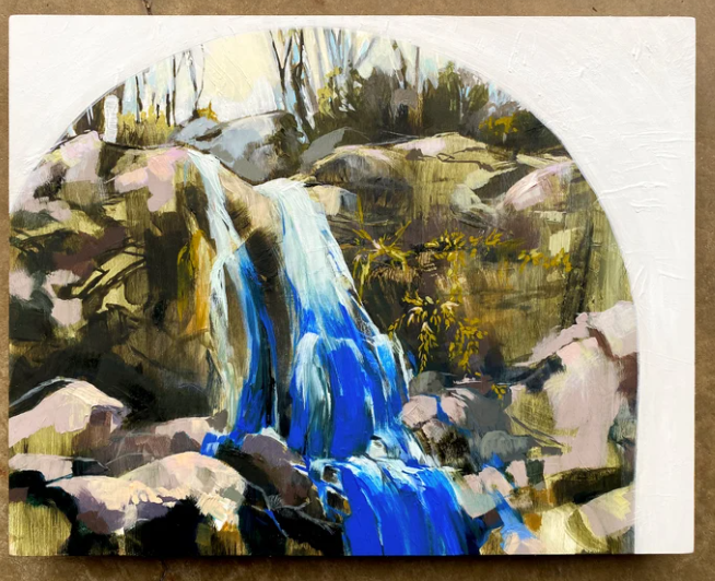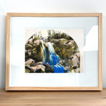 A depiction of High Shoal Falls in North Carolina’s South Mountains State Park. The original was painted with acrylic and gouache on acrylic paper.