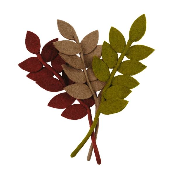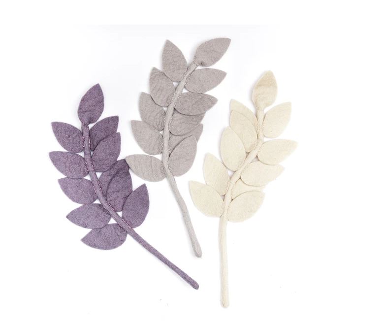 These autumnal Harvest Leaf stems are the perfect filler for a felt flower bouquet to gift the hostess in your life or provide a care package to a family member or friend going through a hard time. Available in Moss, Marsala & Brown, and NEW frost colors: Lilac, Cream & Purple, these stems are a perfect addition to our best-selling felt flowers. Each stem is wet felted, dyed and stitched with care by artisans in Nepal.