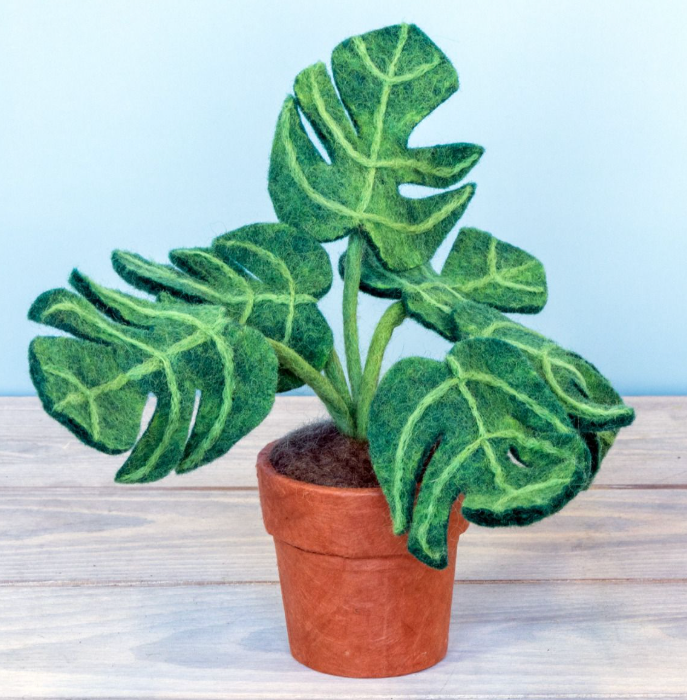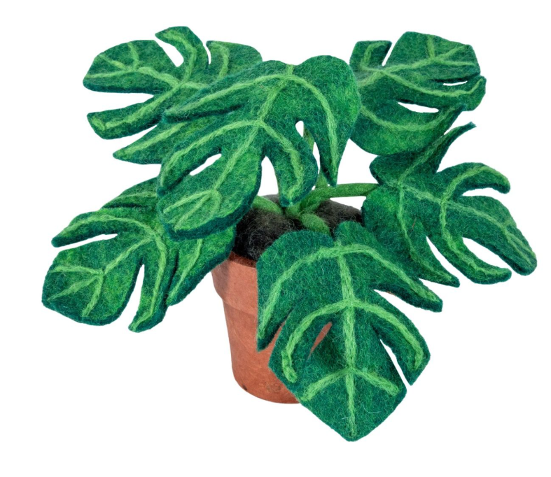 No watering needed for this hand felted plant! Decorative natural wool leaves are mounted onto wool wrapped stems that allow you to arrange the plant as you like. Set into a sturdy handmade eco-pot using sustainably harvested paper over recycled materials. Made exclusively in a fair trade certified production center in Nepal.