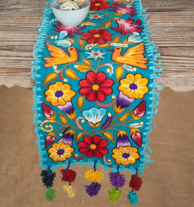 Festive in its beauty, this lovely table runner is created by Peruvian artisan Edwin Choquecahua. Woven by hand from a soft alpaca wool blend, this runner features a body of teal with colorful floral and bird-themed embroidery. Light blue fringe work encircles this table runner, decorated on each end with colorful pompoms.