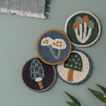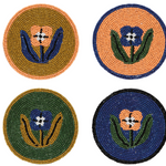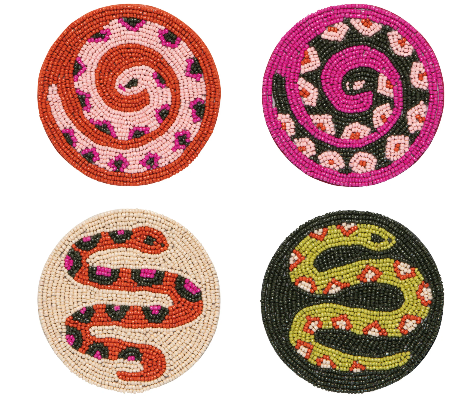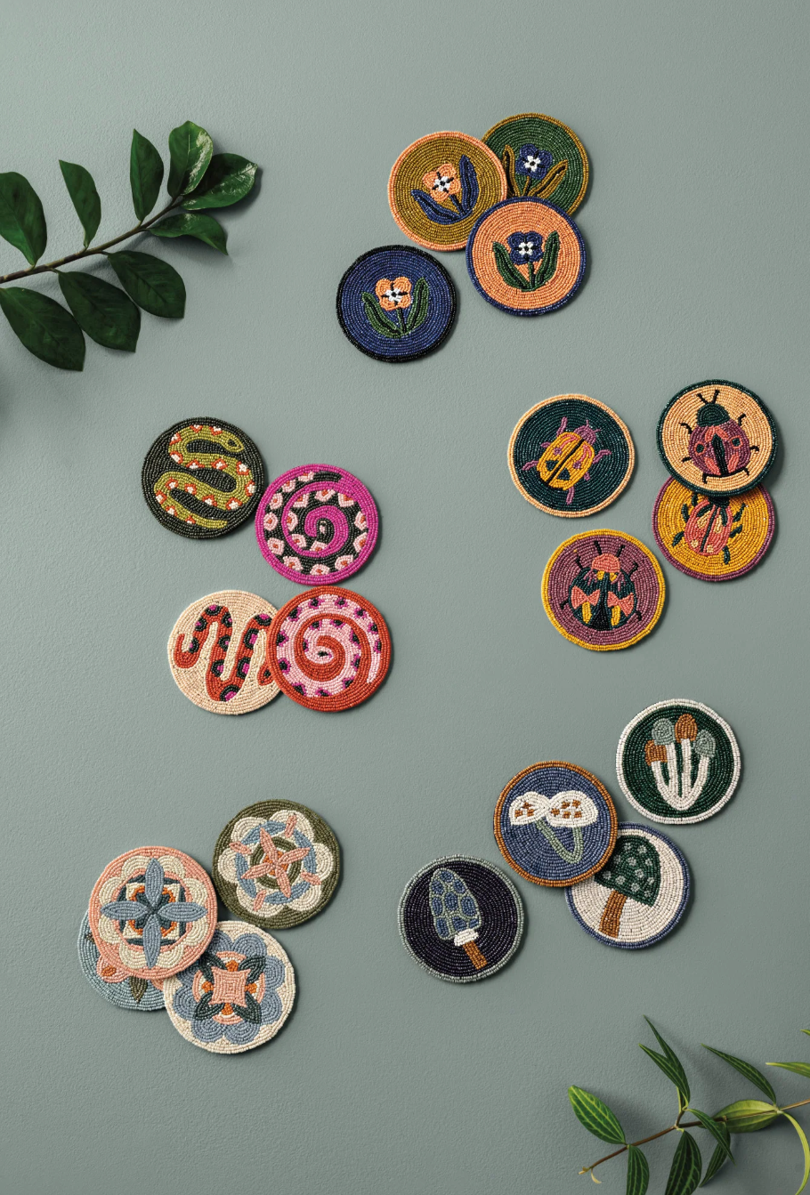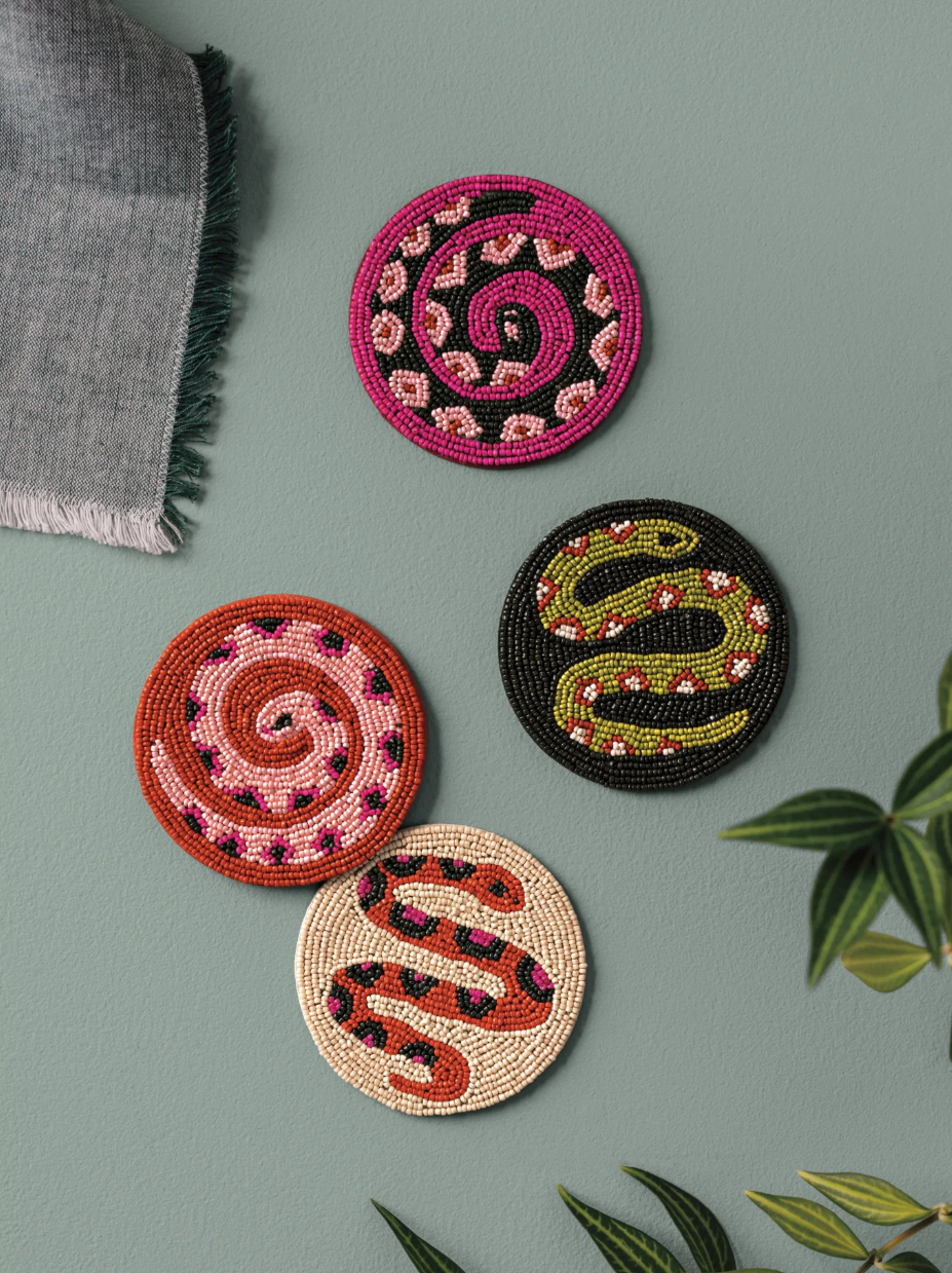 Danica Studio designs radiate from the surface of our hand-beaded coaster set from the Gardenland collection. With earthy greens, bold pops of pink and citron, these coasters give a magnified glimpse of slithering snakes in the garden. Crafted with dyed glass beads and a strong fabric core, these little beauties are made to last.