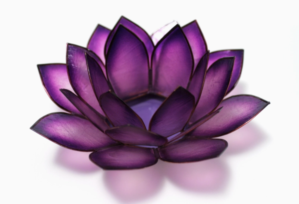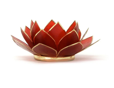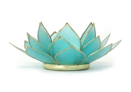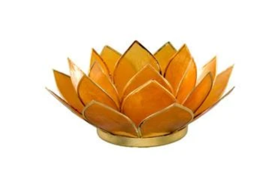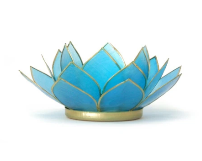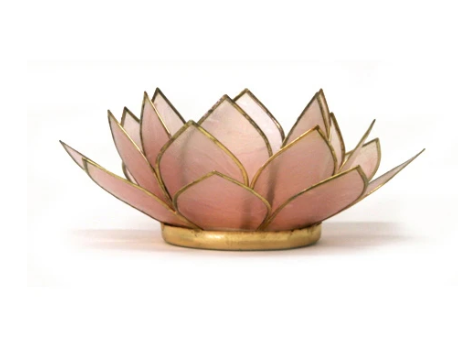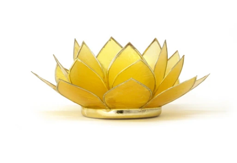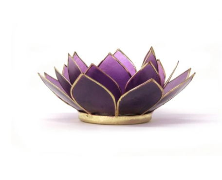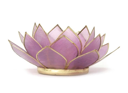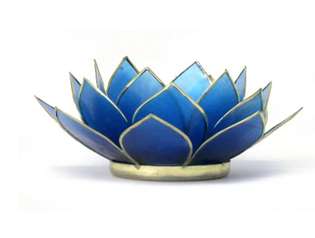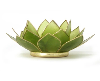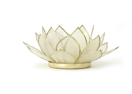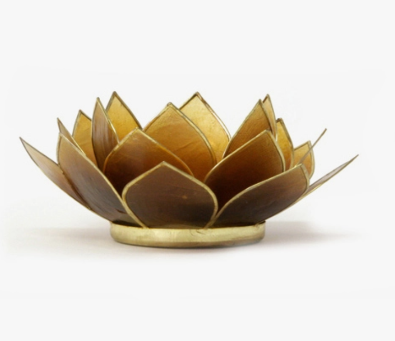 This handmade tea light holder is designed in the shape of an open lotus flower, with three rings of translucent capiz shell petals. 5" from tip to tip, 2" high. Shell edges and bases are gold color and electro-plated, giving each tea light holder a stunning look. Use with wax, battery-powered tea light, or small votive candle.
