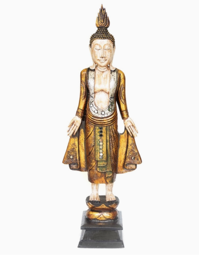 This standing buddha ornament is hand carved in Bali from albizia wood and features intricate gold accents.