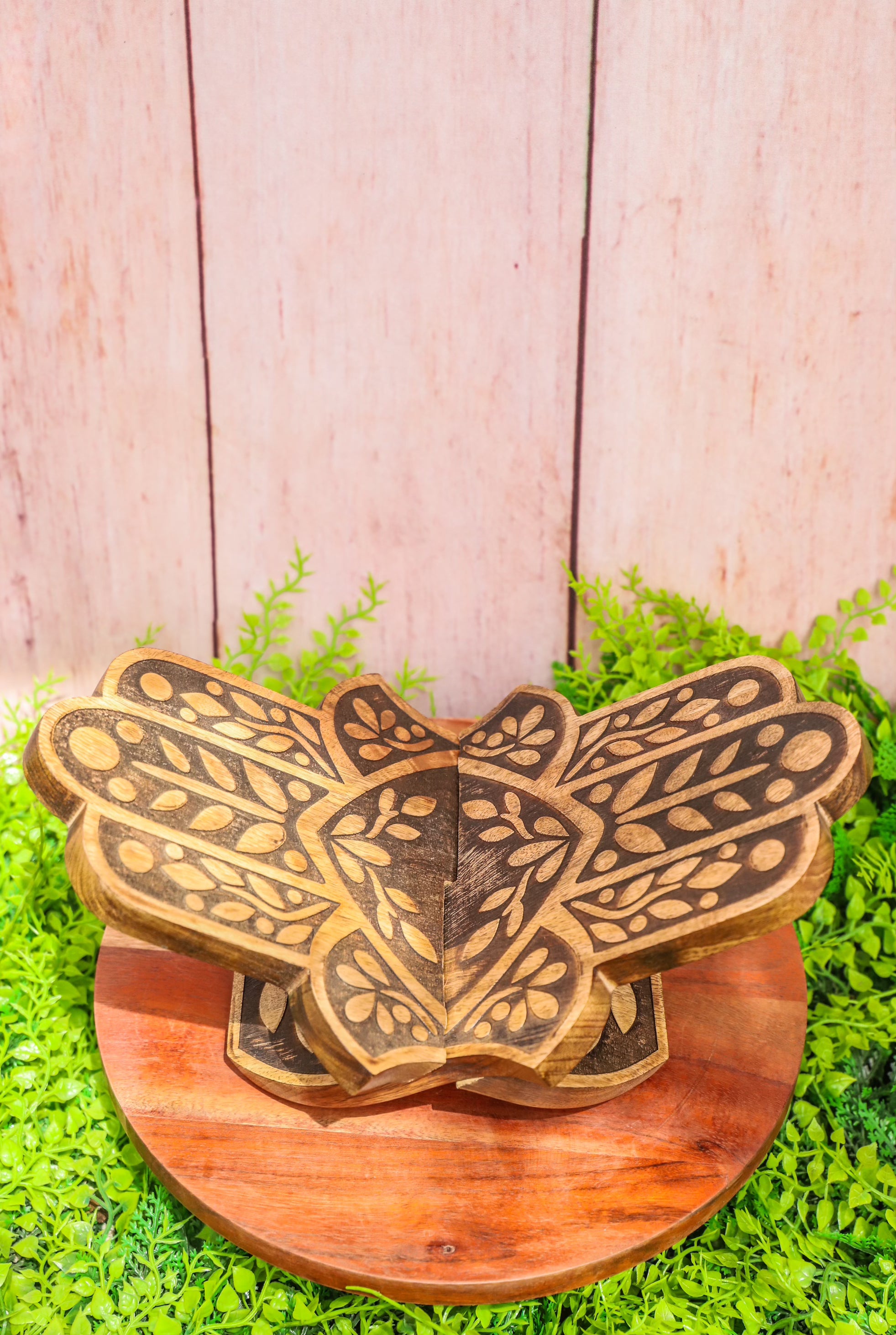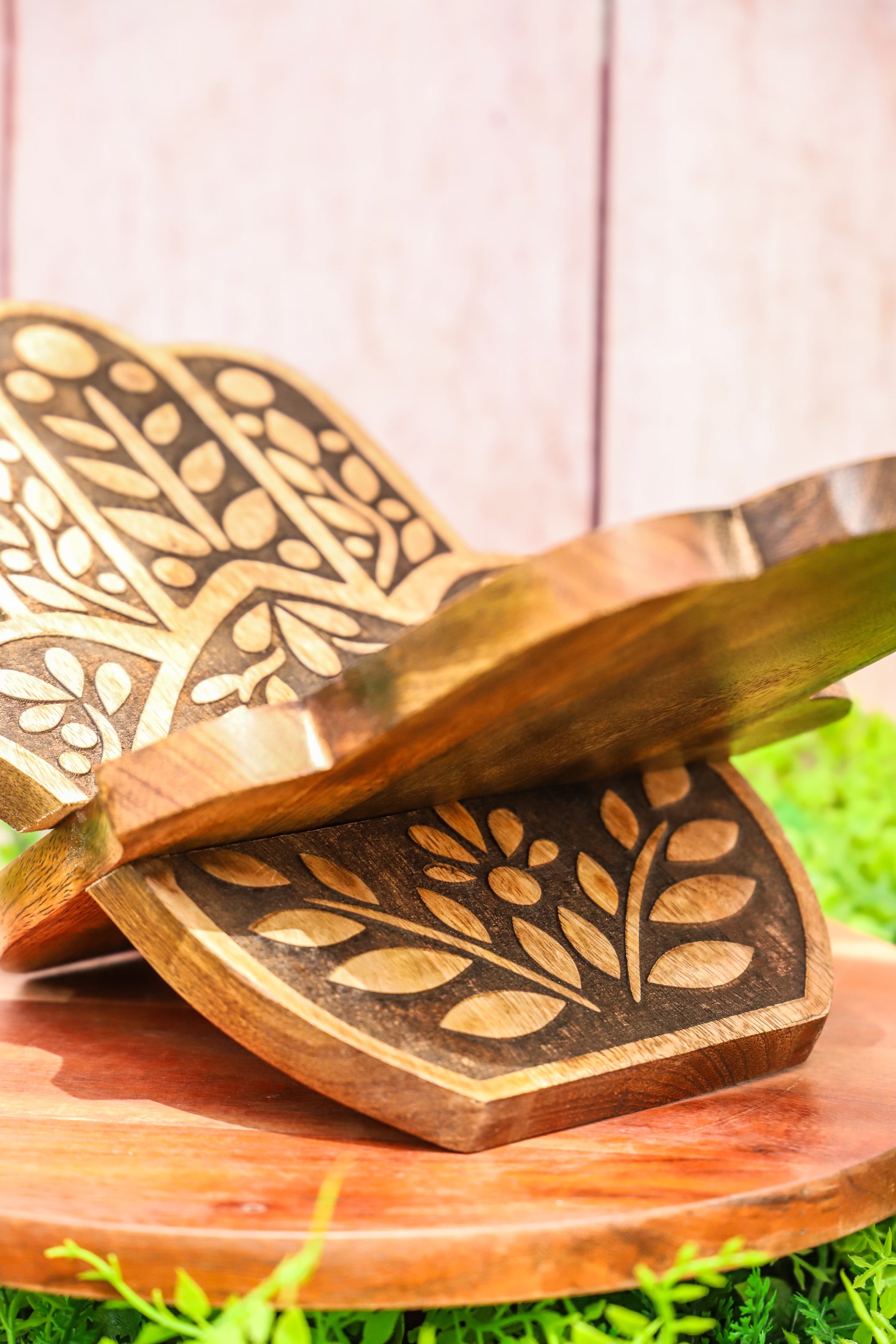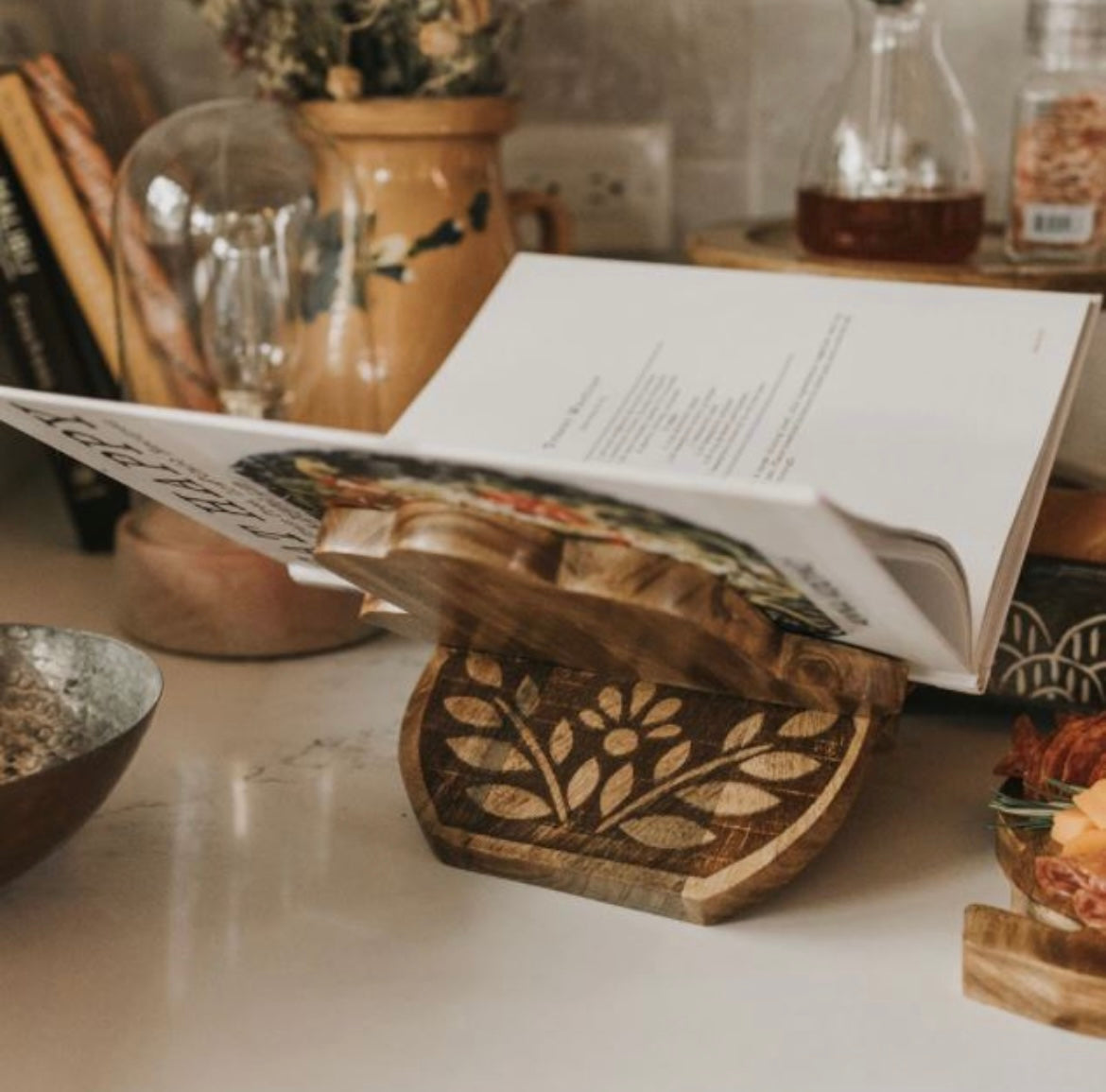 Ethically hand carved from sustainably harvested mango wood in north central India, this unique open book stand features a Hamsa hand design with intricately hand carved floral motif detail. The art of traditional Indian wood craft requires mastery, passed down through generations, to create intricately hand carved treasures from solid blocks of mango wood. The results are long-lasting home favorites elegantly combining form and function. This unique book stand features an interlocking, two-part Hamsa hand design which allows the book to rest in an open position. The stand will arrive in two parts, to be assembled in store or by the customer. The open book design is ideal for cookbooks.