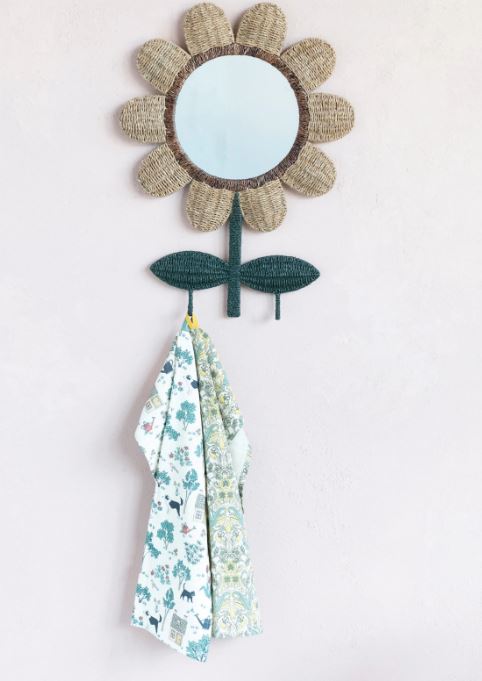Hand-Woven Bankuan and Metal Flower Wall Mirror with 2 Hooks