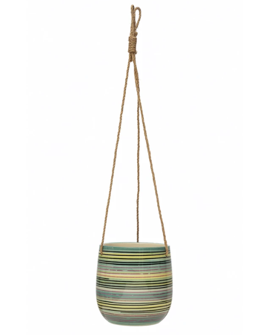 Hanging Stoneware Striped Planter with Jute Rope Hanger