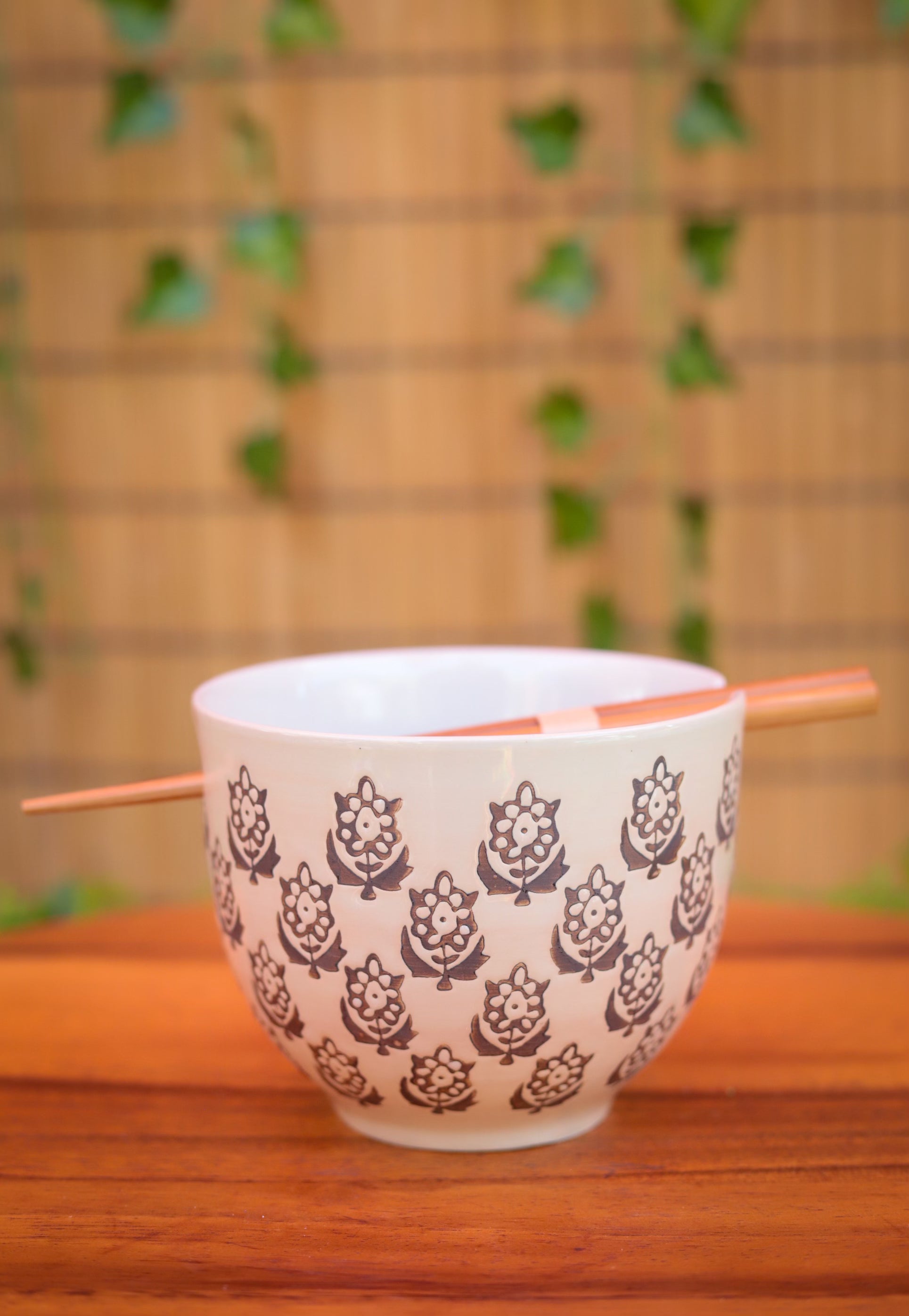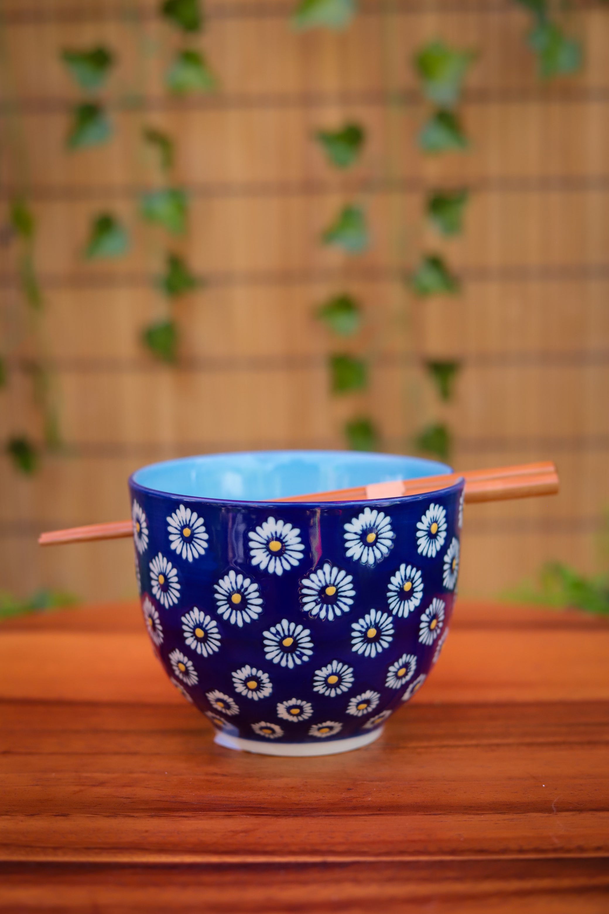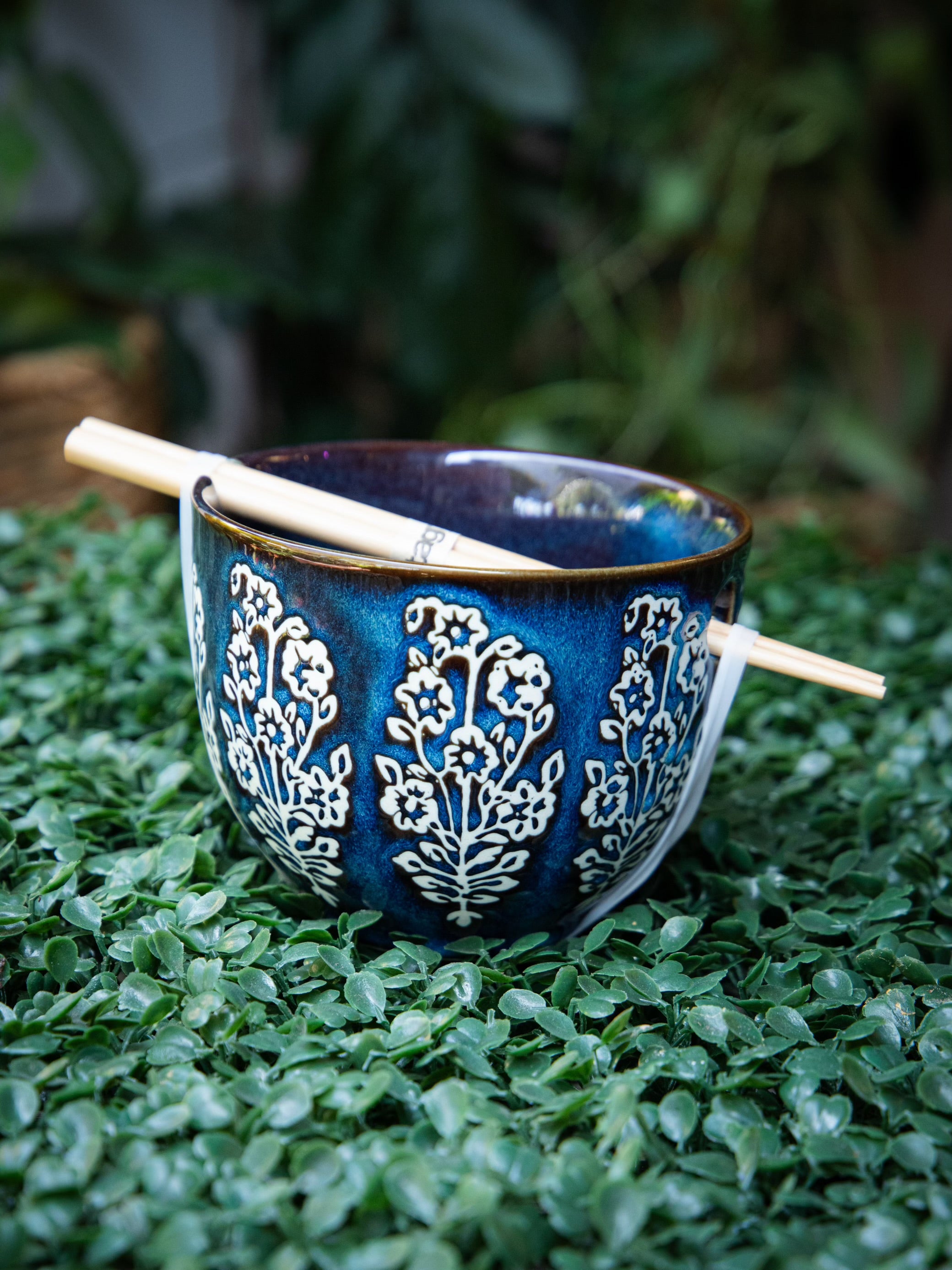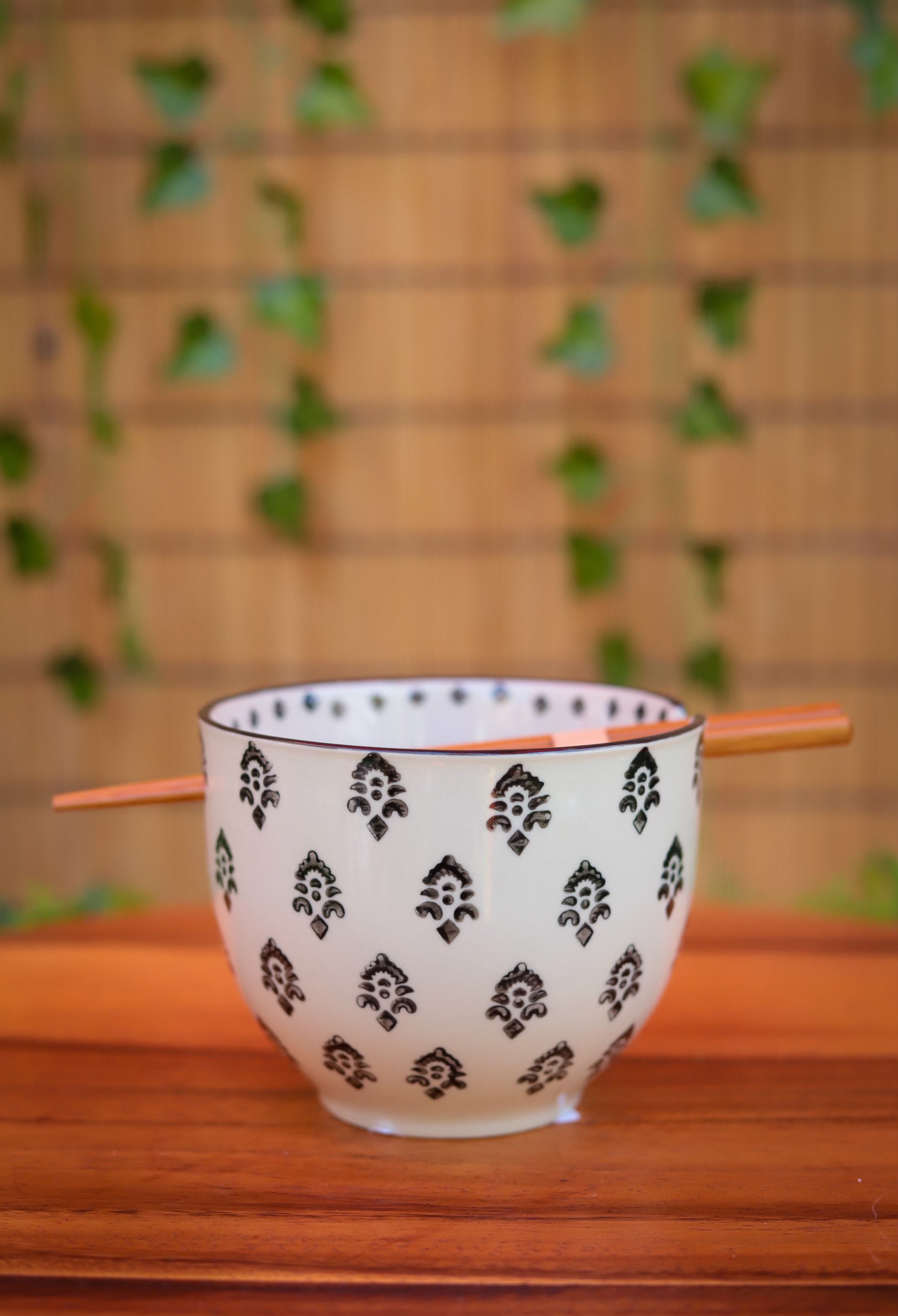 This stoneware bowl comes with a set of chopsticks. It is perfect for noodles and soups as it is a deep dish with a built-in resting place for bamboo chopsticks.