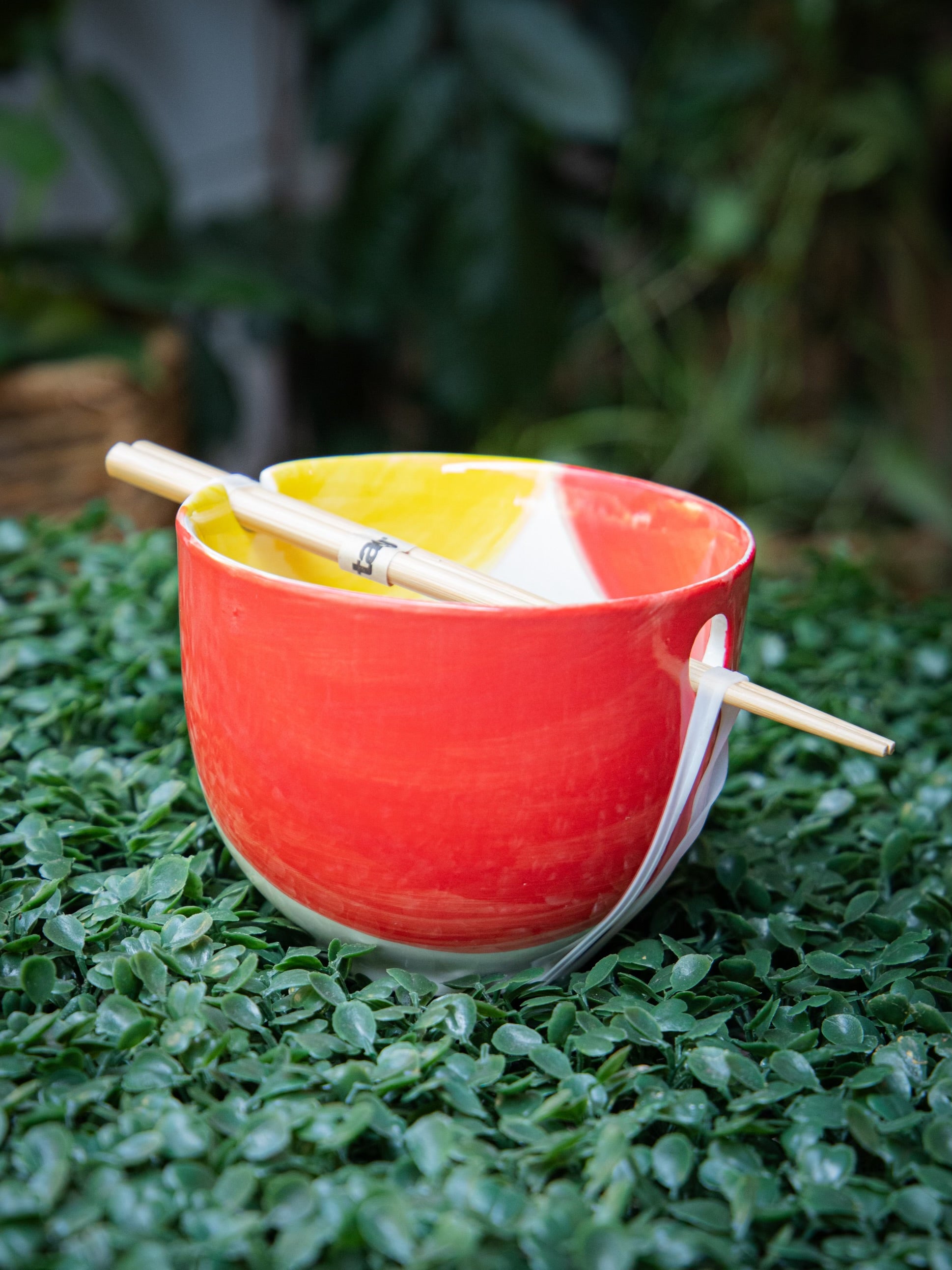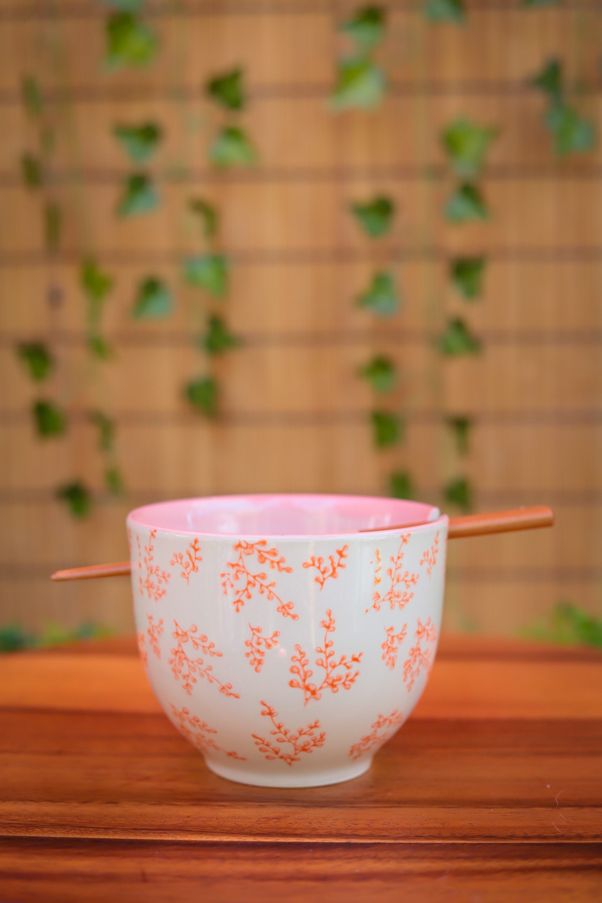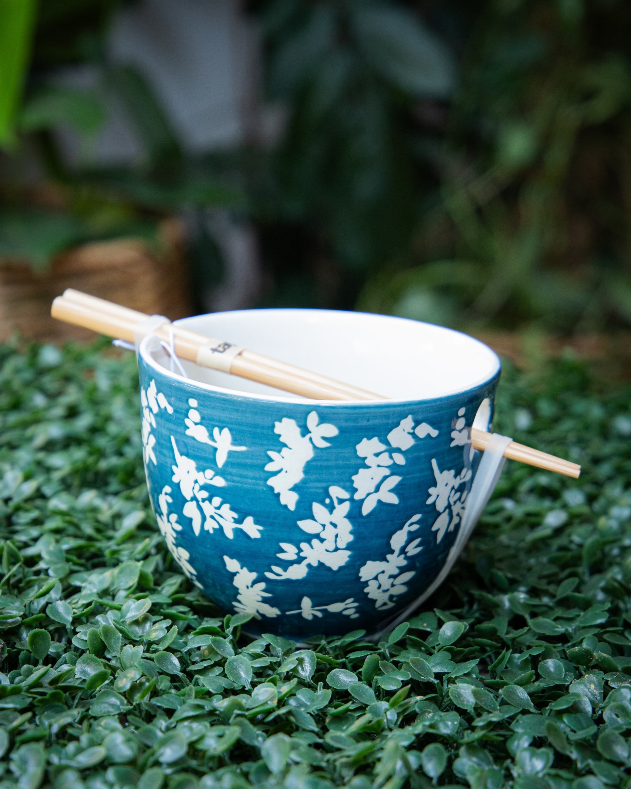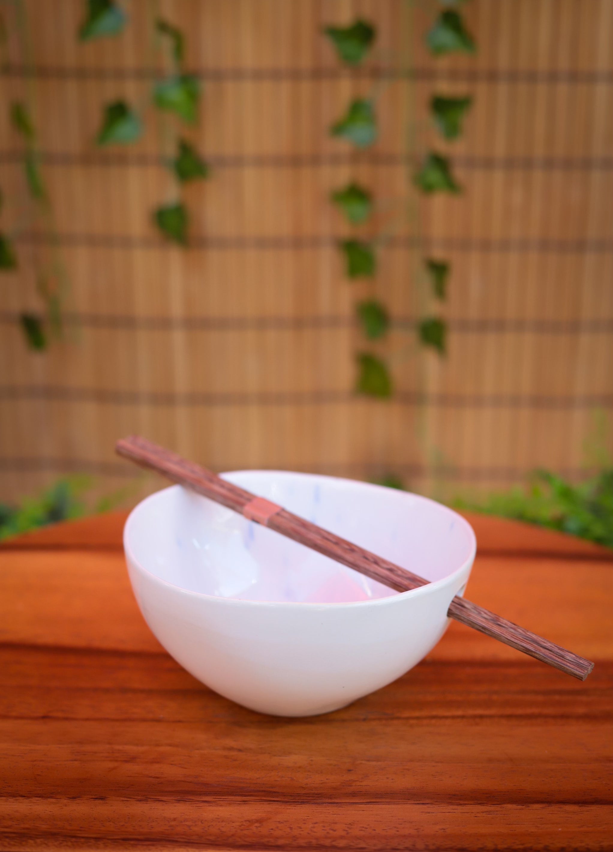 This stoneware bowl comes with a set of chopsticks. It is perfect for noodles and soups as it is a deep dish with a built-in resting place for bamboo chopsticks.