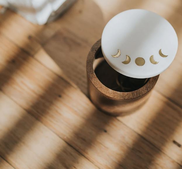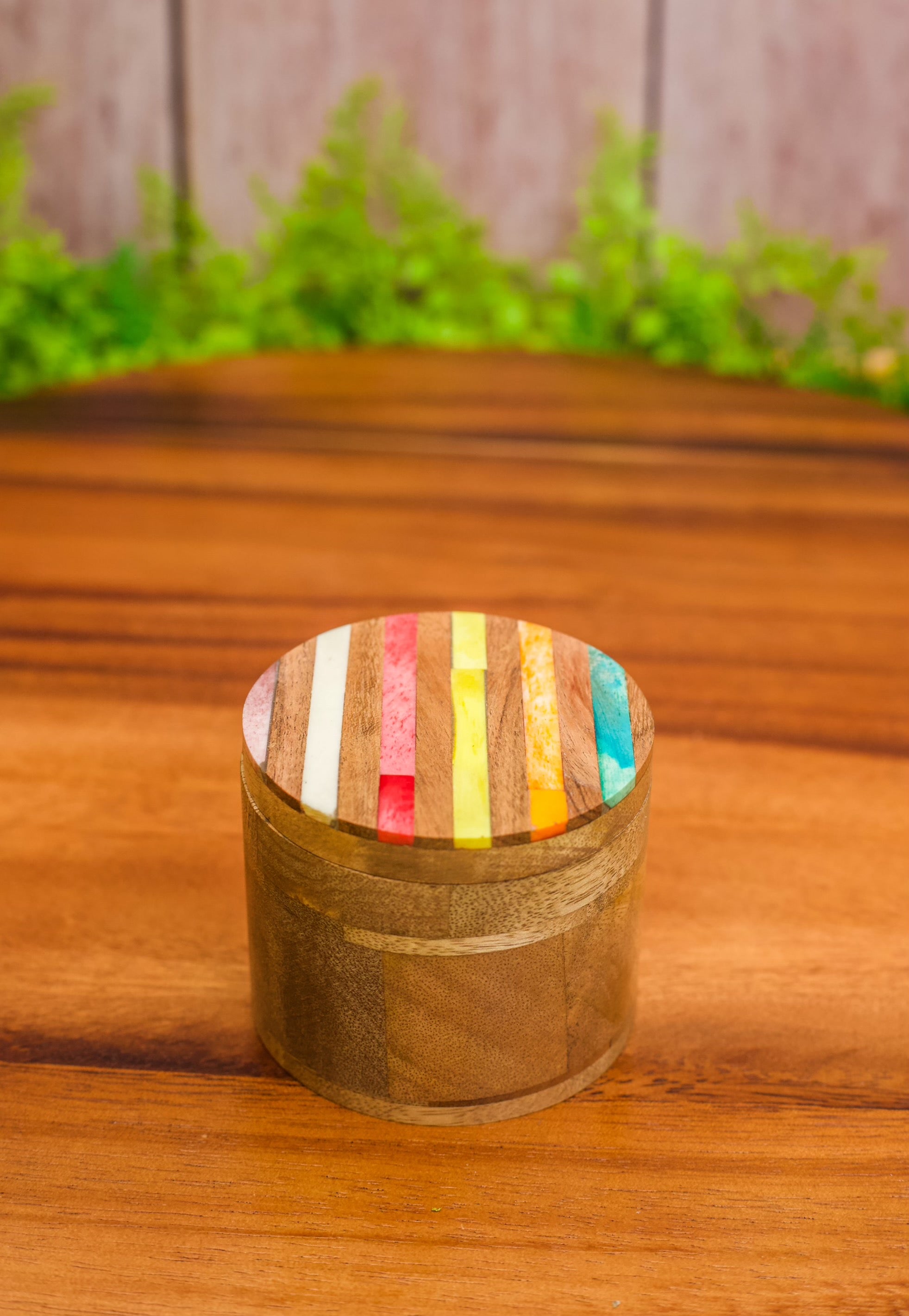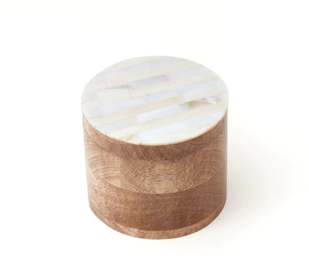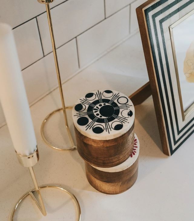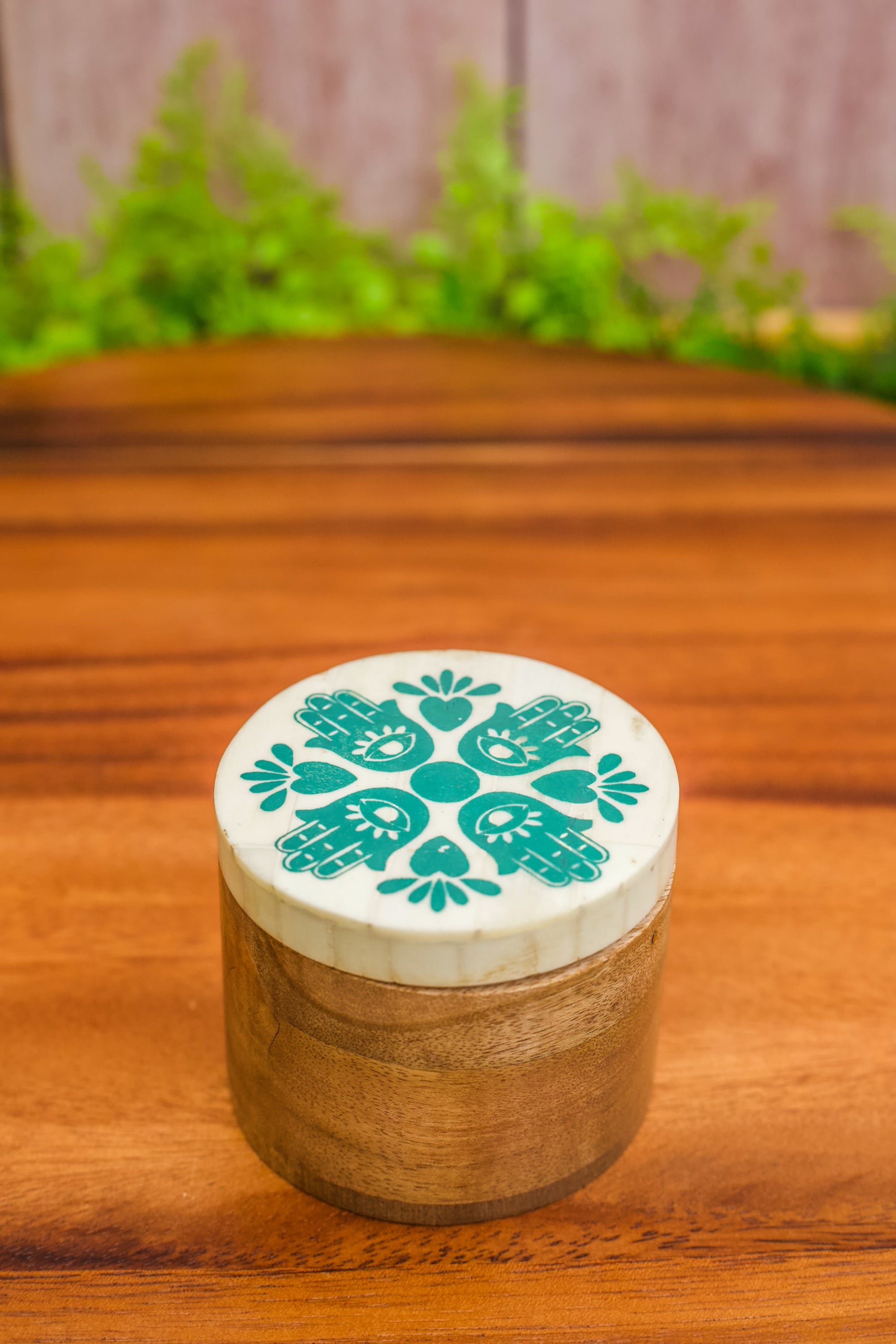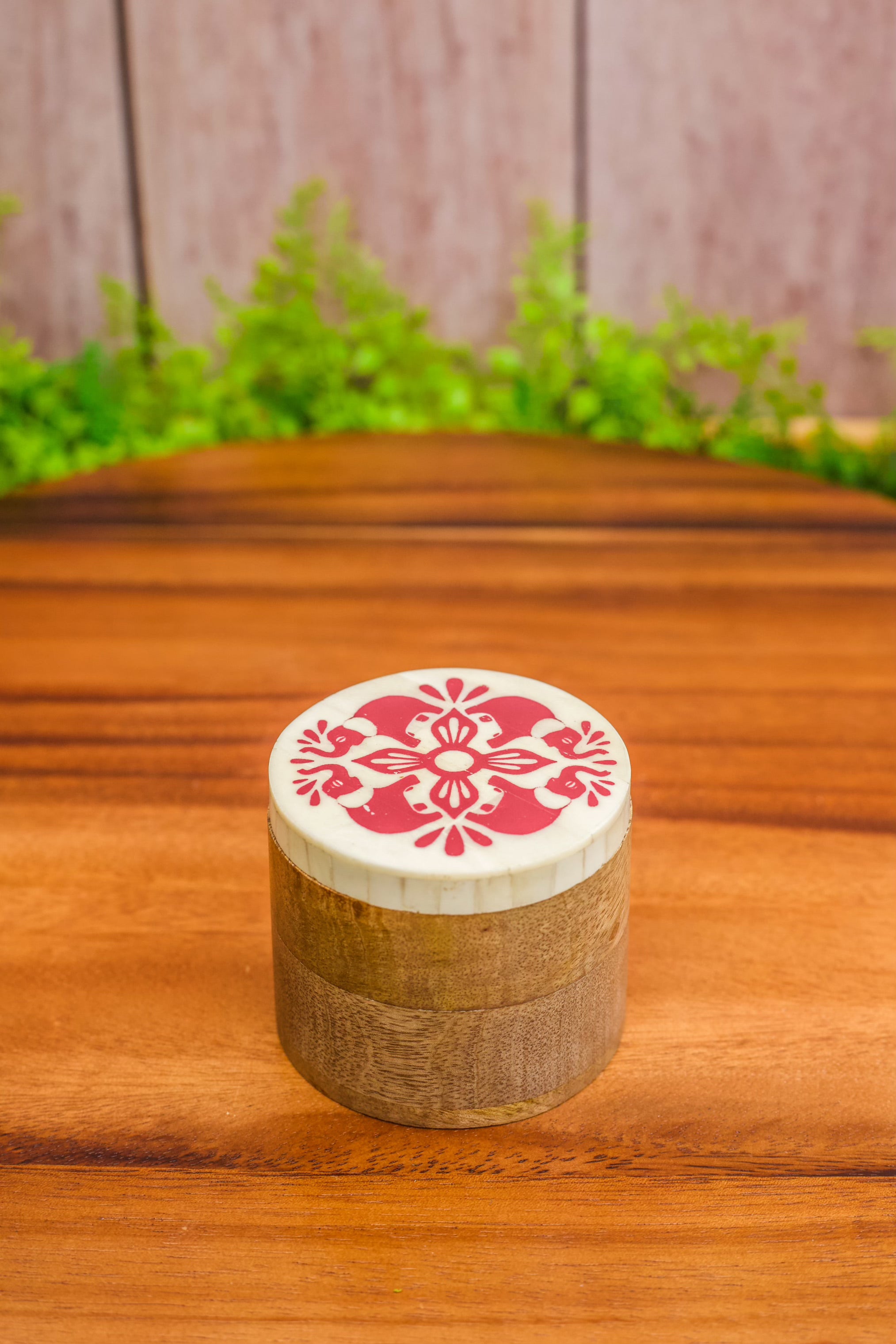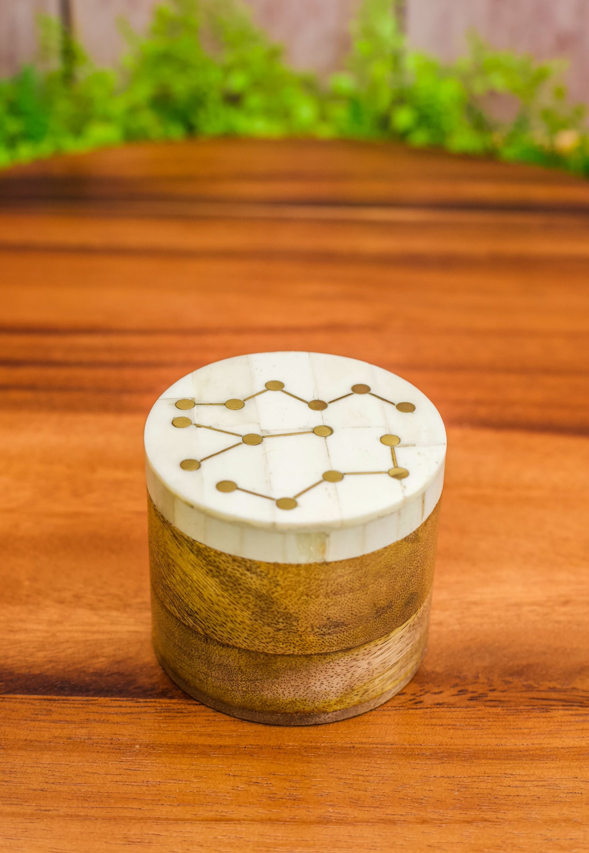 Our handcrafted Ankura Keepsake Box Collection incorporates traditional Indian art forms in modern designs, featuring sustainably harvested mango wood, ethically sourced bone, and hand detailed, flora and fauna inspired designs. Master artisans in Old Delhi skillfully hand carve wood and bone elements to create unique, eye catching inlay designs. This handcrafted round keepsake box is thoughtfully designed for stylish safekeeping. The hand carved bone lid features a blooming lunar phase design. Lid lifts completely to reveal a cylindrical, open interior.