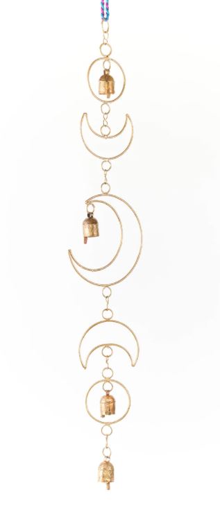 Our Indukala Chime Collection incorporates age-old bell making and metal craft techniques in modern, lunar-inspired designs featuring upcycled iron and copper bells and accents. Bell making is a traditional artform passed down for generations in the desert Kutch region of India. This enchanting bell chime features a cascading crescent moon design with four handcrafted Indian bells, finished with a convenient hanging loop.