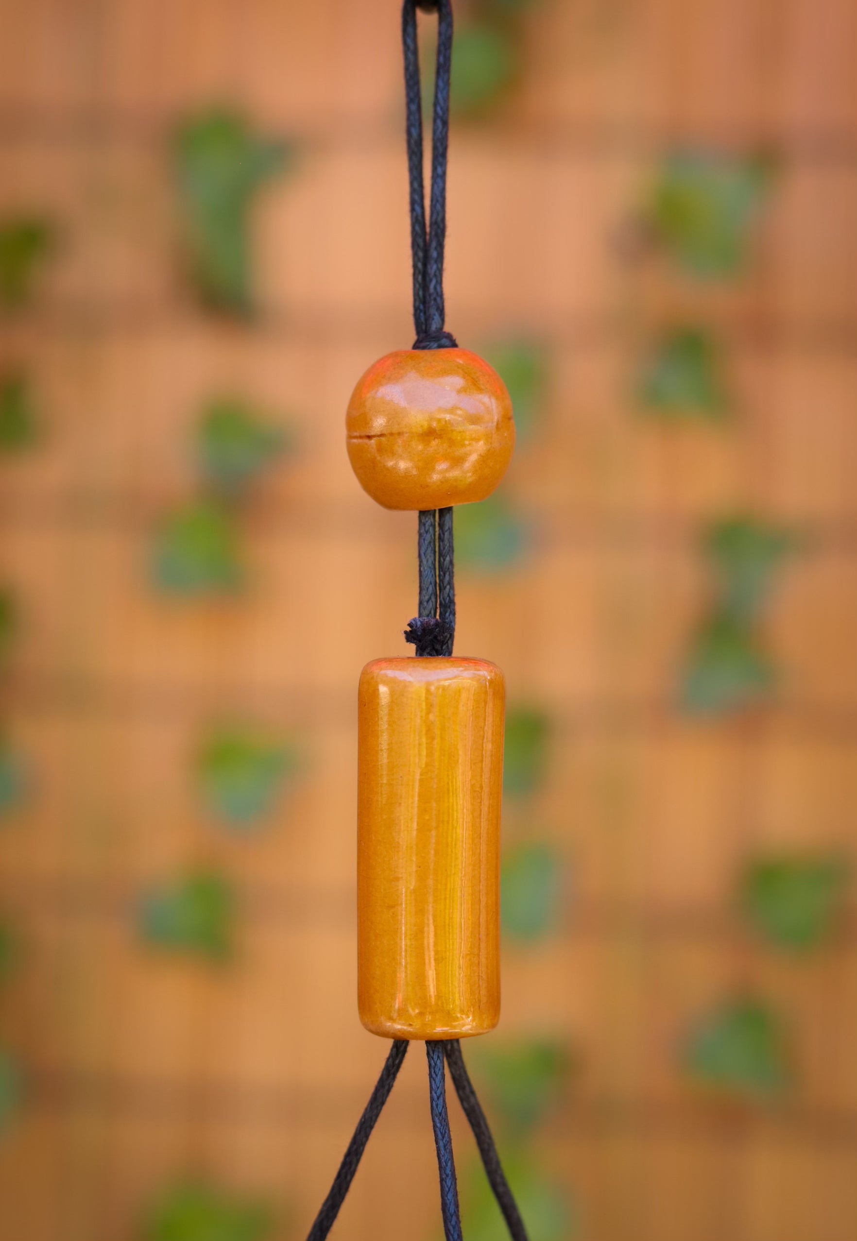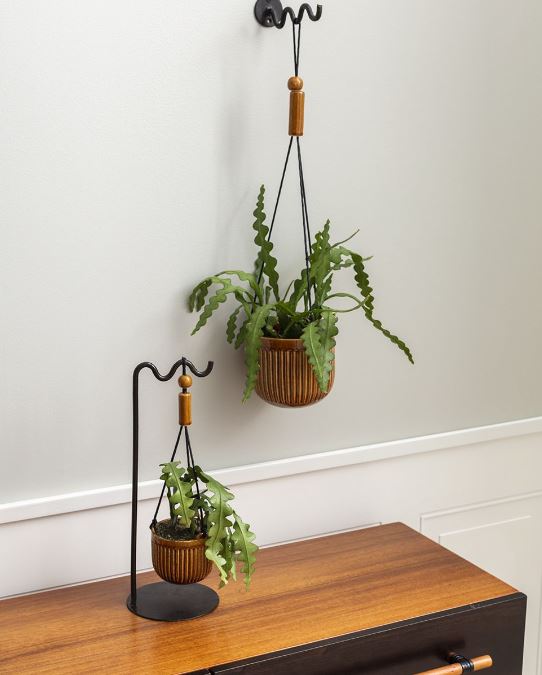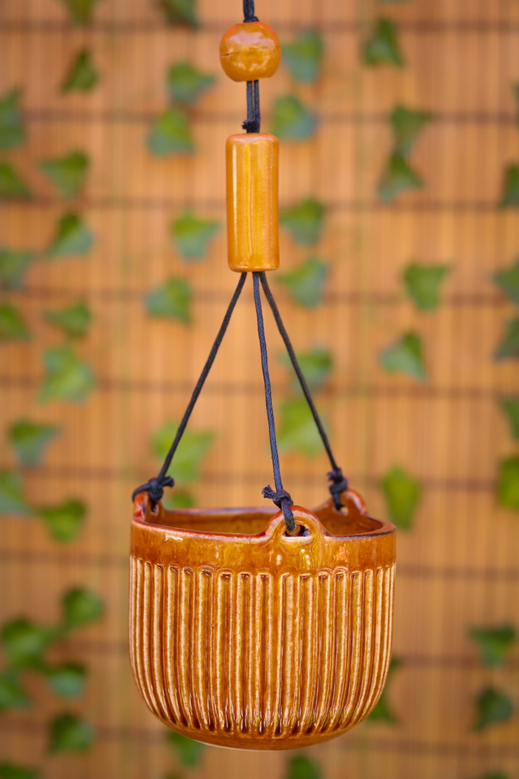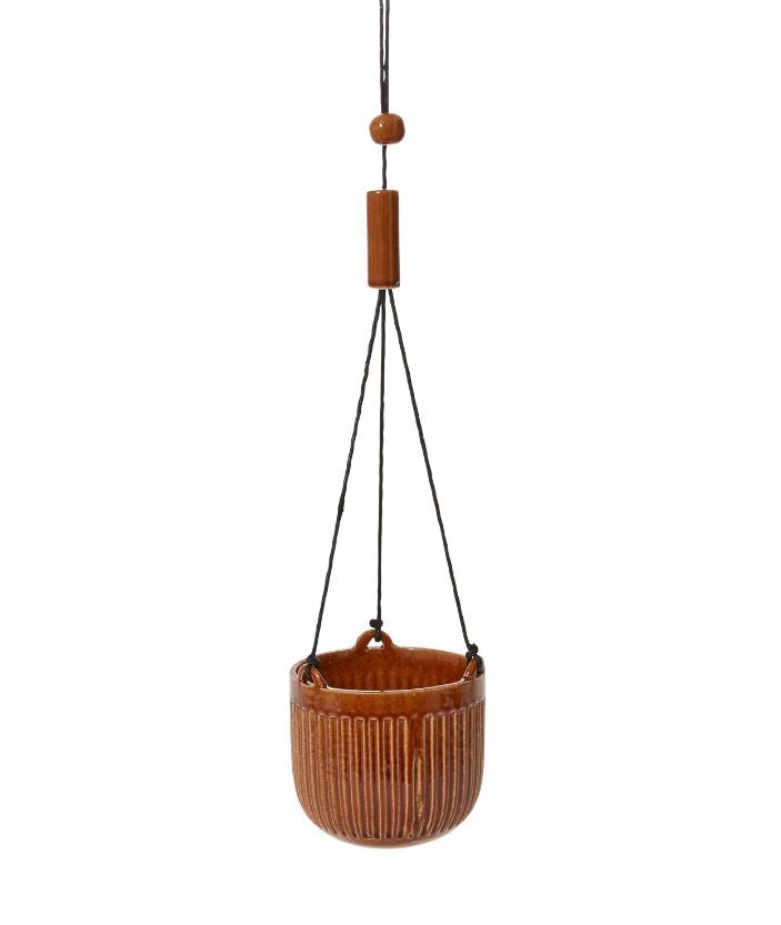 A sleek ribbed design, with varied gloss amber colored glaze, and round black leather cord with beads makes the Irwin Hanging Pot an everyday staple for every plant-lover’s collection. Hook is not included.