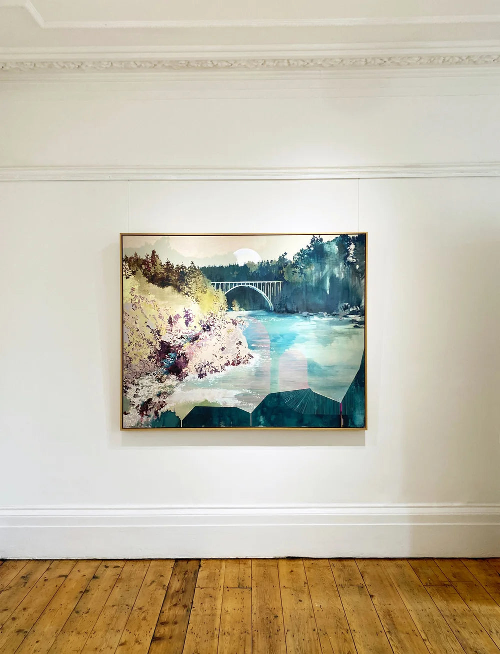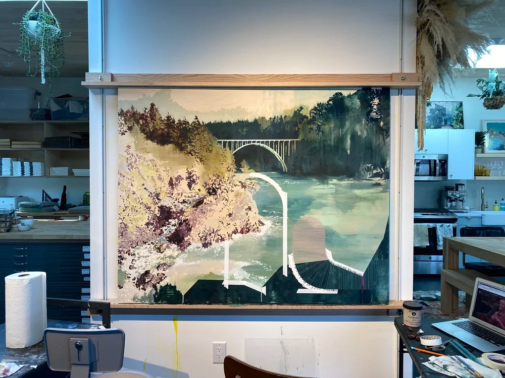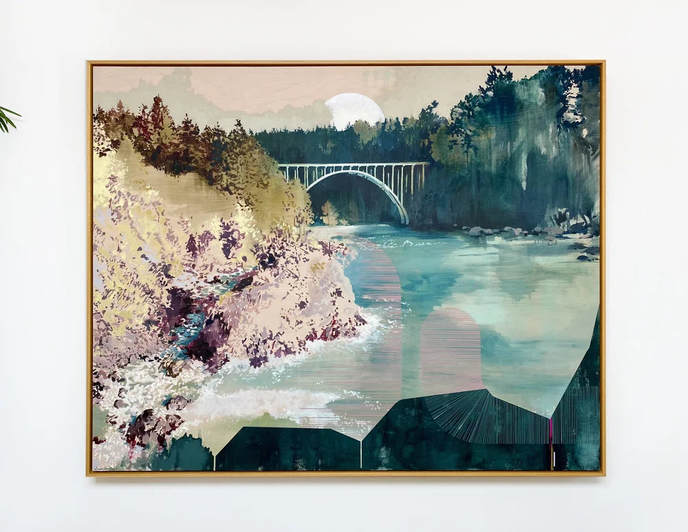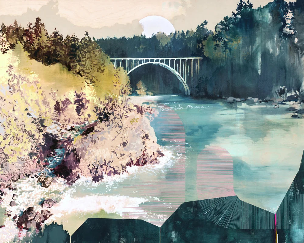 The philosophies of Buddhism outline 4 elements that sustain and build the true source of love. My favorite is that of “karuna”, which describes the principle of compassion: the desire to lessen the suffering of your beloved, and the development of a deep compassion for the world around you in general. This painting depicts the Russian Gulch area right by Mendocino, California, where I married my own true love. The arching structures leading up from the bottom represent our paths converging here, meeting in a place very dear to both of us, while the iconic Panhorst Bridge symbolizes the union of our masculinity and femininity in the glow of a new season of partnership. I endeavor to bring the principles of karuna into this union, and by extension to the landscape that will chaperone us. Mendocino, like so much of California, is in need of actionable compassion as it faces the modern dilemmas of climate change in the West, namely the wildfire and drought that threaten to destroy it.