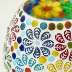 A mosaic mixture of pattern in vibrant block colours creates a floral medley design on this glass tealight holder. Pop in a lit tealight to warm the atmosphere with multi colour vibes on outdoor summer evenings.