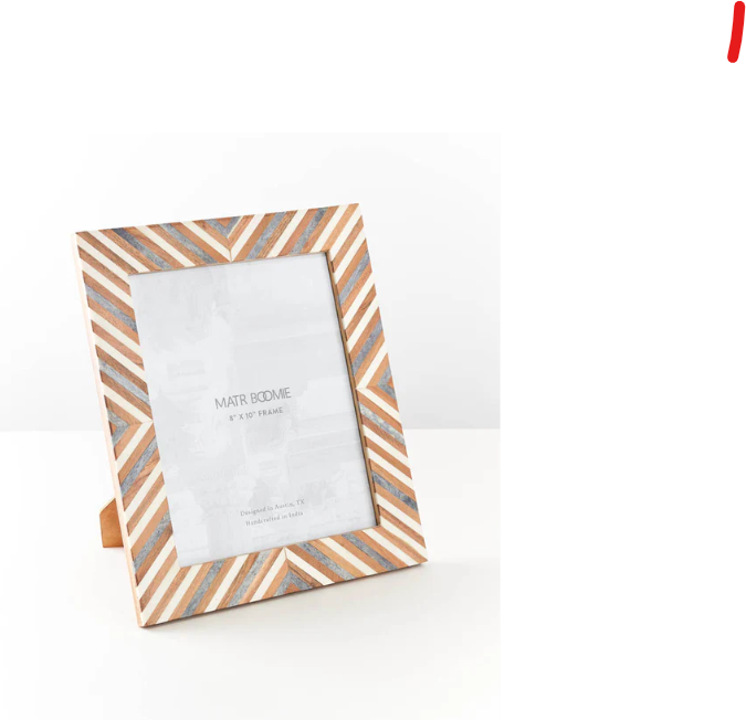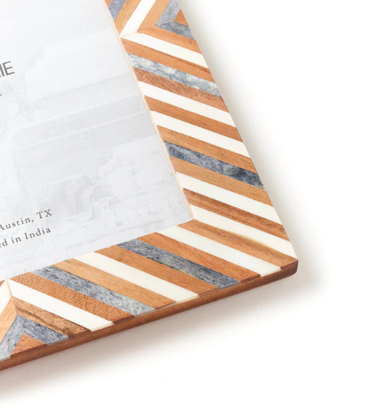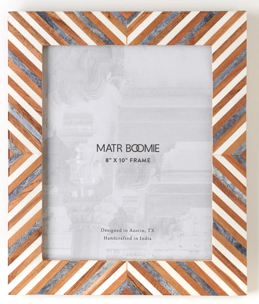Our Banka Mundi Collection incorporates traditional Indian art forms in modern designs featuring ethically sourced bone and sustainably harvested mango wood. Master artisans in Old Delhi skillfully hand carve wood and bone elements to create unique, eye catching inlay designs.This handcrafted photo frame is thoughtfully designed for stylish display of an 8x10 photo or print and features a two-way table top easel and two d-rings for hanging.