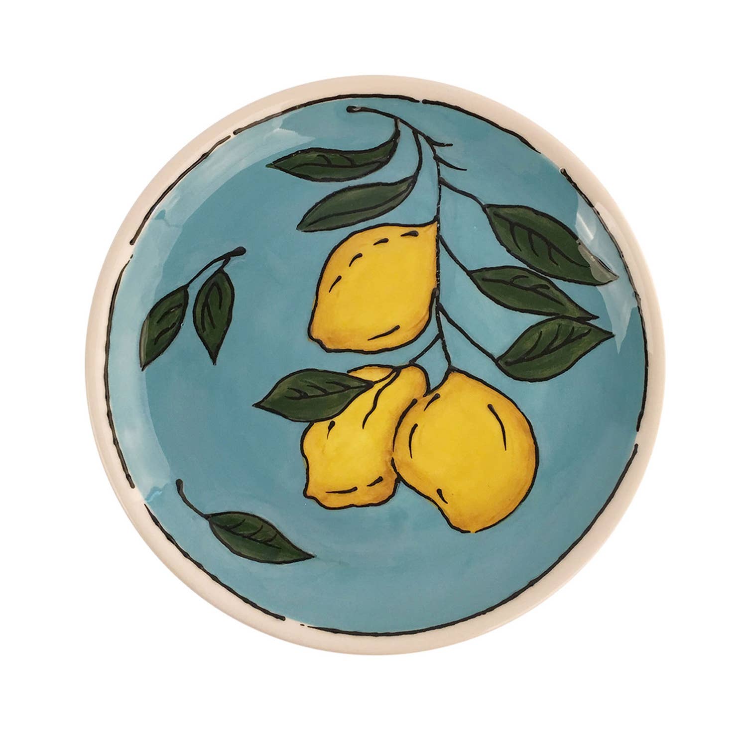 The Lemon Sky Side Plate by Blue Sky Clayworks is a handcrafted ceramic piece featuring a vibrant lemon motif against a tranquil blue sky background. Each plate is meticulously sculpted and painted by skilled artisans, ensuring a unique and high-quality addition to your tableware collection.