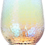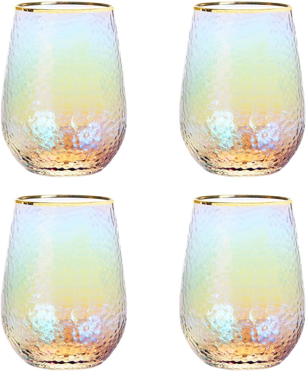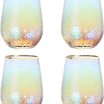 - These lustered stemless wine glasses are perfect for enjoying your favorite wine at home or toasting to a special occasion. Each glass is made of durable borosilicate glass with a lustered shine. Featuring a high-quality gold rim finish and the proprietary luster finish, it gives the glasses a bright sheen that shines in any light and make it a wonderful addition to any table. * Enjoy spirits with sophistication & class as you sip a way with this set of four glasses that are pieces to admire. Featuring a statuesque look, these glasses making drinking not only a unique experience, but a lively affair. * The best way to sample your favorite wines is to try them straight-up.
