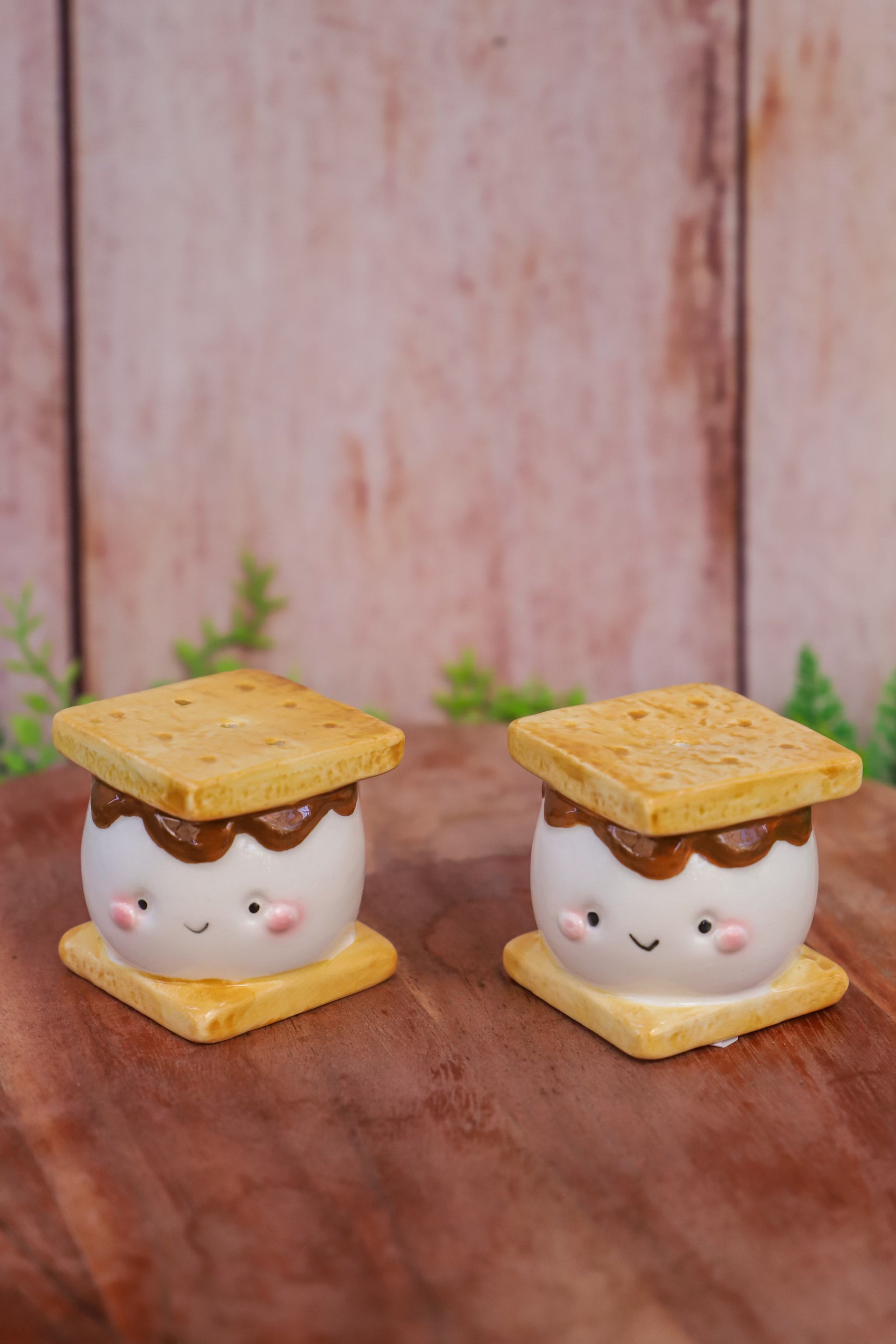 Streamline Imagined Marshmallow S'mores Salt and Pepper Shaker Set: Who doesn't love a campfire s'mores dessert? The Marshmallow S'More Salt & Pepper Set combines that camping nostalgia for graham crackers, chocolate and burnt marshmallows with the collectible nature of salt and pepper shakers. While the Marshmallow S'more Salt & Pepper Set is made of painted ceramic, the features of a classic set of s'mores are all there. A sweet, happy-faced, chocolate-topped marshmallow is sandwiched between two grahams on each shaker. Rosy cheeks make these almost too cute to use as shakers but the functionality makes them a great addition to a cabin or home table. Made from Ceramic | Packaged in a colorful and attractive gift box.