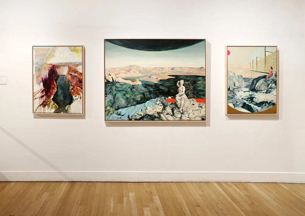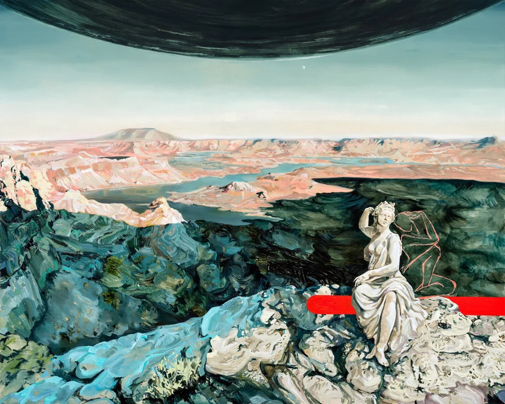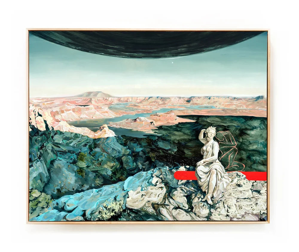“The May Queen” was commissioned by the Boulder Museum of Contemporary Art as part of Noelle Phares’s 2024 exhibition that focuses on the Colorado River. The piece depicts a view of Lake Powell, a large reservoir impounding the river above Glen Canyon Dam. A sculpture of the Greek goddess of water, Amphritite, stands high above the water, symbolizing the futility of relying on higher powers to protect this precious body of water that is increasingly imperiled as climate change and rising human demand threatens its future availability.