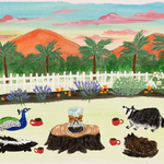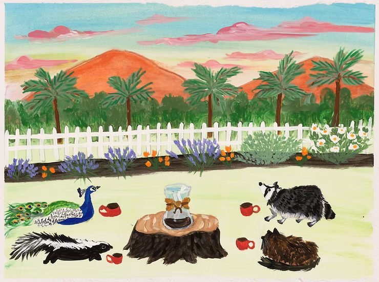 Some friends enjoying their morning coffee together. This piece is a tribute to Altadena mornings and wildlife and features a peacock, a skunk, a raccoon and a little cat. This print supports Pasadena Humane Society, an organization that did incredible work during the Eaton Fire to help pets and wildlife impacted by the devastation.